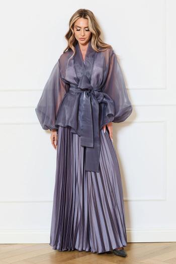 Туника без застежки, с отрезной планкой горловины. Плечо спущенное. Рукав длинный, с отрезной манжетой. По шву притачивания манжеты рукав присборен. Туника со съемным поясом.