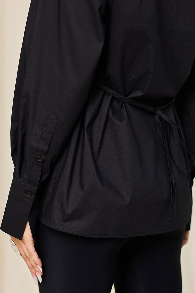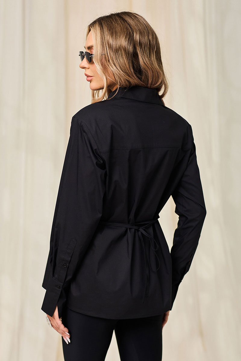 Блузка, с центральной потайной застежкой на петли и пуговицы по планке переда, с втачным воротником с отрезной стойкой. Плечевой шов переходит на перед. По спинке с отрезной кокеткой. Рукав втачной, длинный, с отрезной манжетой. Манжета застегивается на одну петлю и пуговицу. Блузка со съемным пояском. По боковым швам расположены шлевки для пояса.