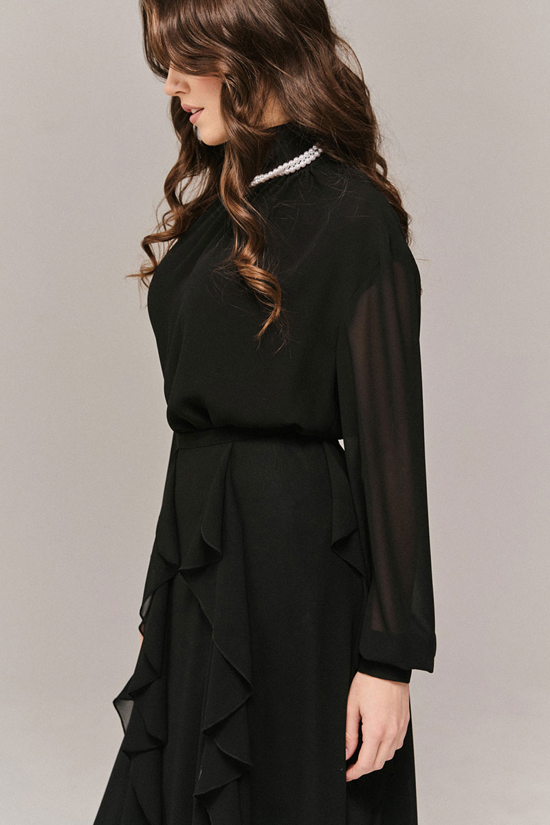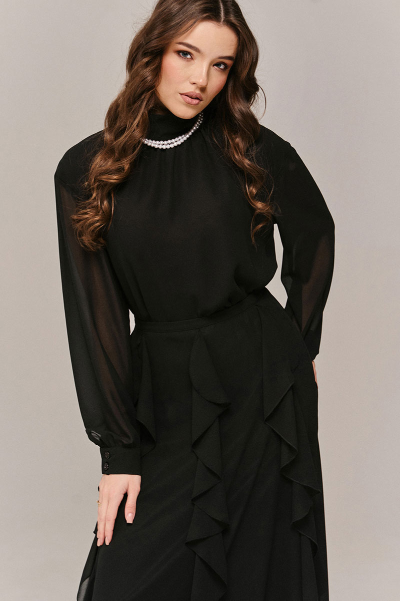 Блузка из шифона, прямого силуэта. С застежкой по спинке на петли-пуговицы, рукав рубашечного типа на притачной манжете. Перед двойной со сборкой по линии горловины, спинка с кокеткой. Воротник стойка.