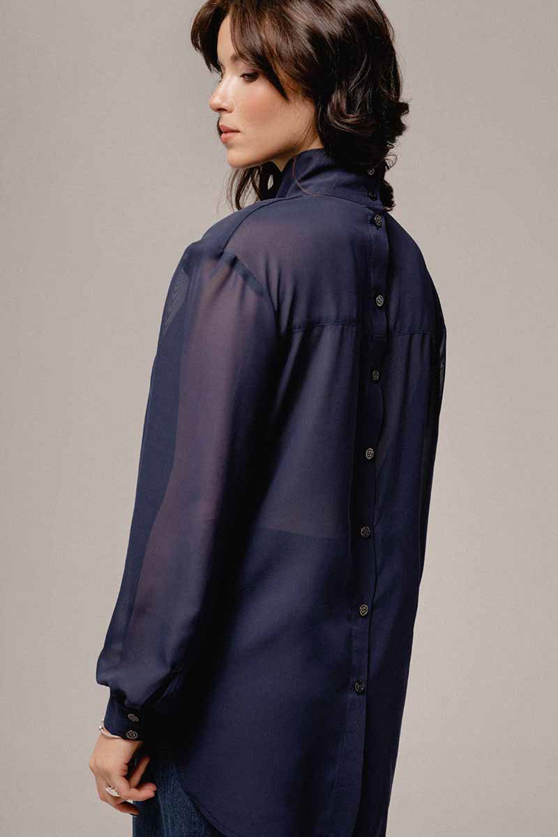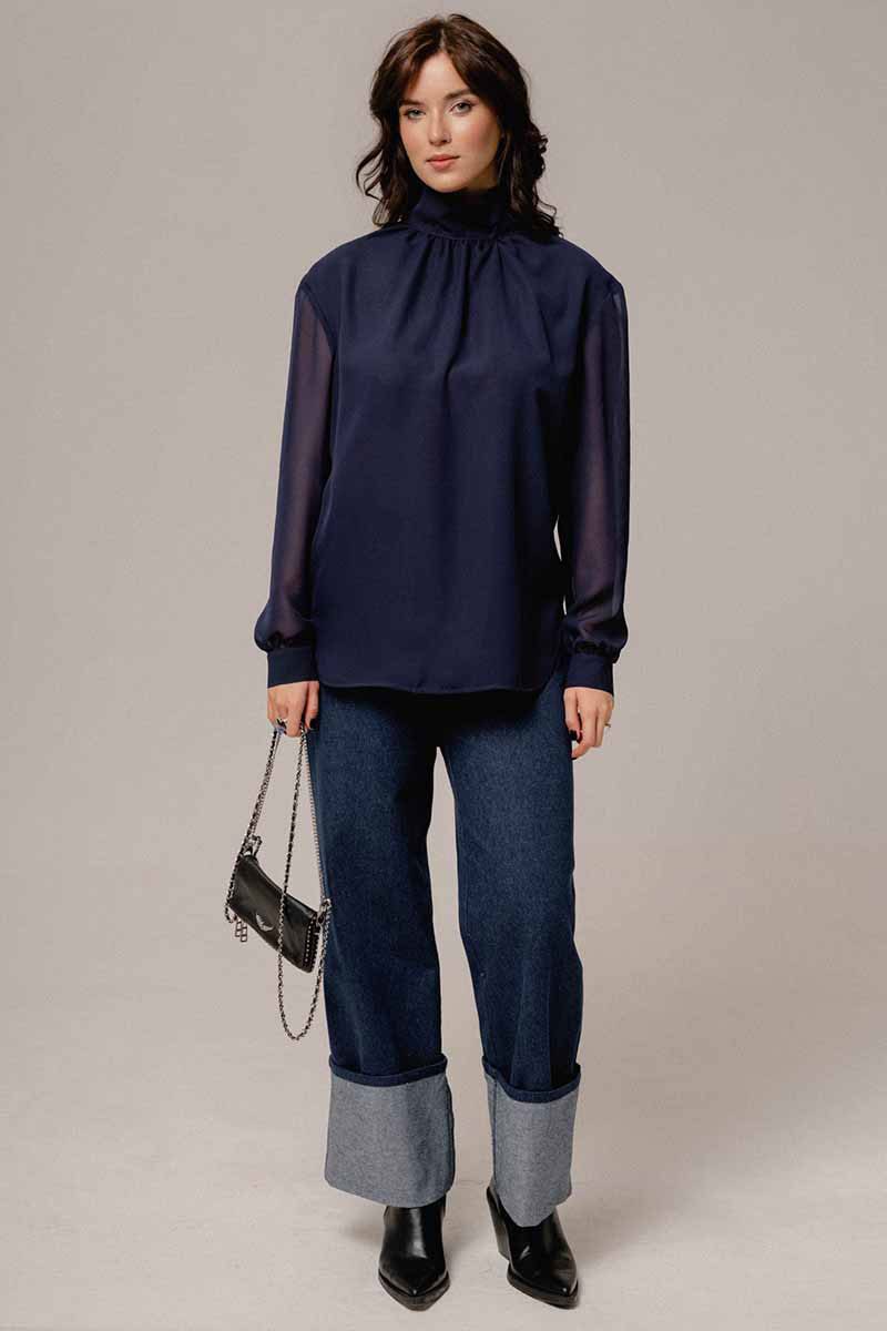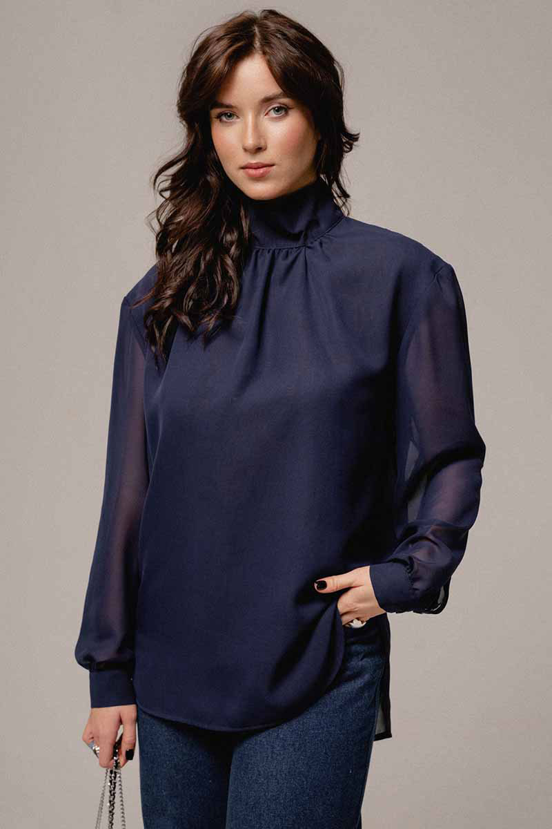 Блузка из шифона, прямого силуэта. С застежкой по спинке на петли-пуговицы, рукав рубашечного типа на притачной манжете. Перед двойной со сборкой по линии горловины, спинка с кокеткой. Воротник стойка.