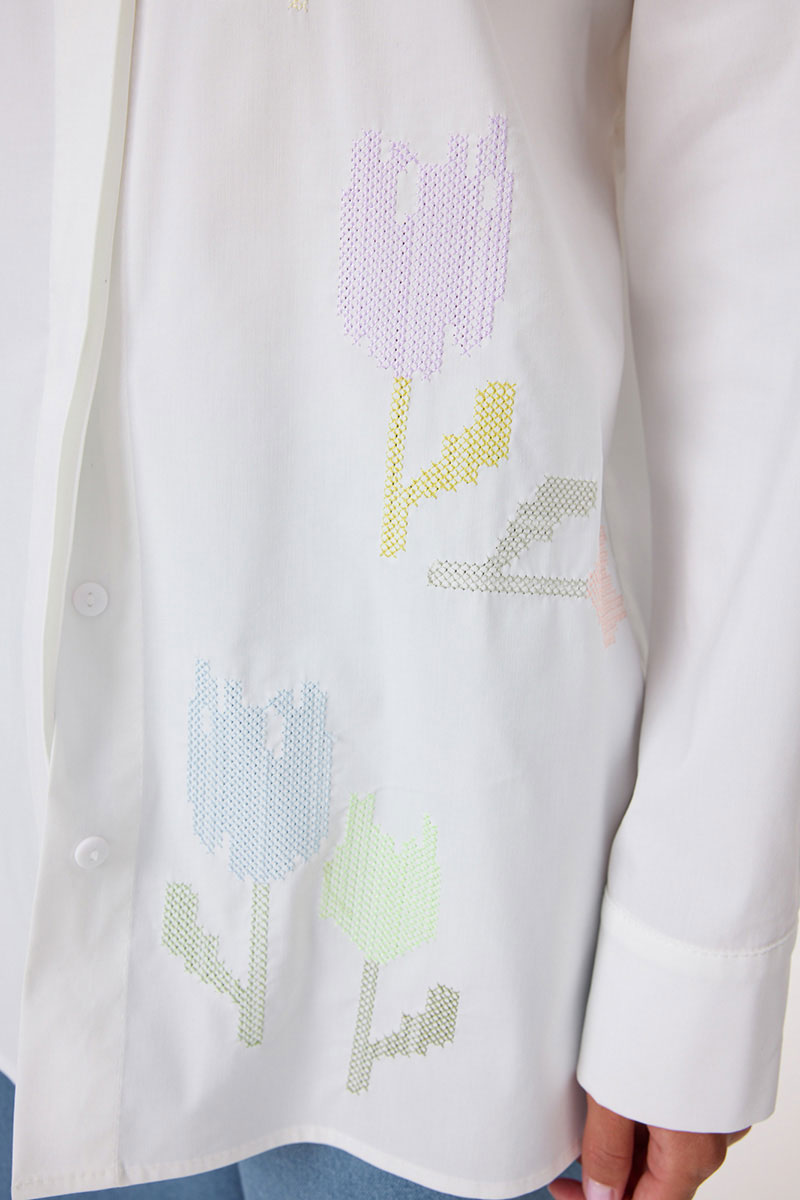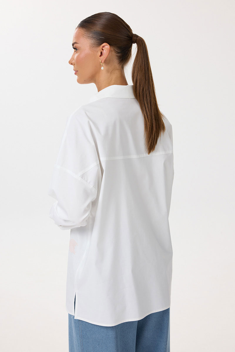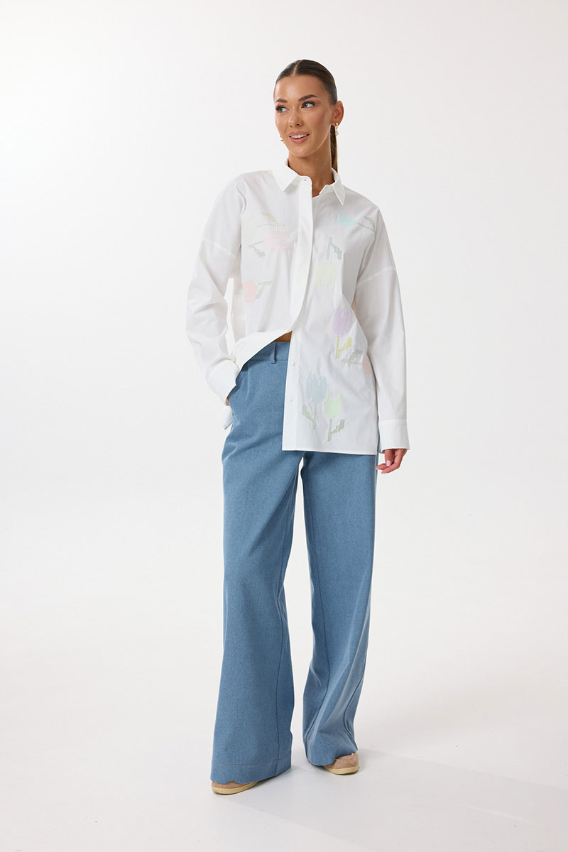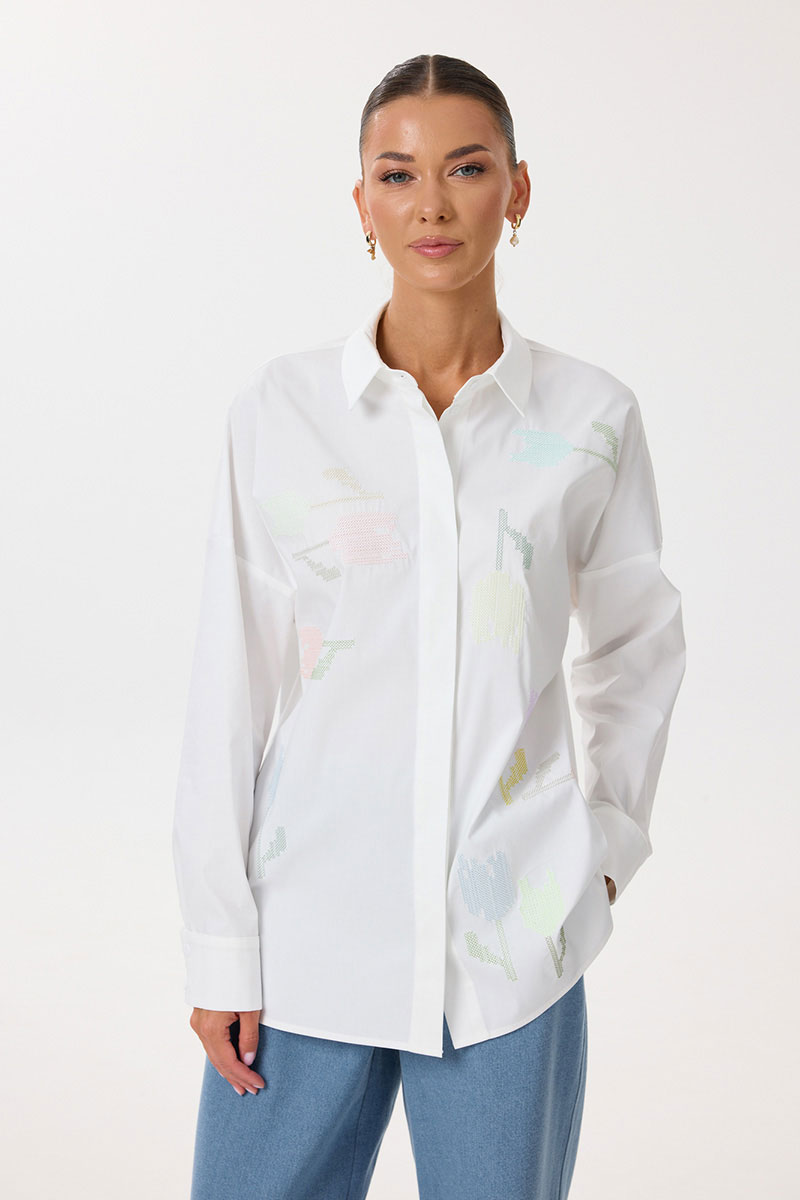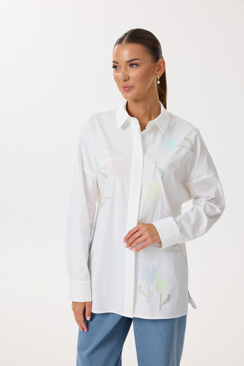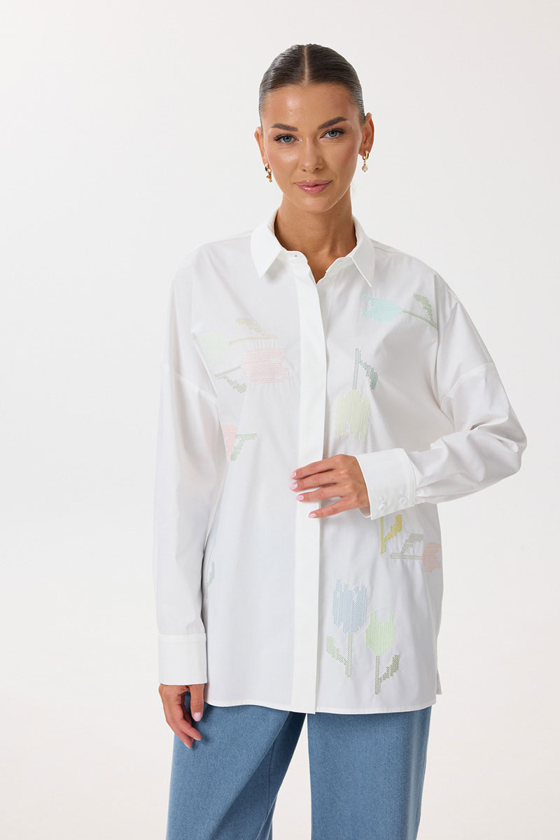 Блузка женская прямого силуэта. Перед с центральной застежкой на петли и пуговицы, декорирован авторской вышивкой. Спинка с кокеткой. Плечо спущено. Рукав длинный одношовный, по низу со складками. Низ рукава обработан притачной манжетой, застегивающейся на петли и пуговицы. В боковых швах обработаны разрезы. Горловина обработана воротником рубашечного типа с отрезной стойкой. Декоративные элементы и фурнитура могут отличаться от заявленных на фото.