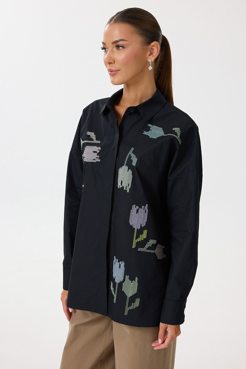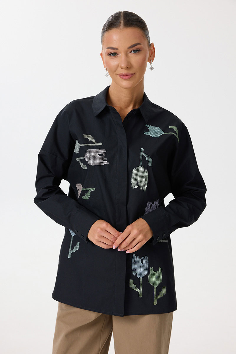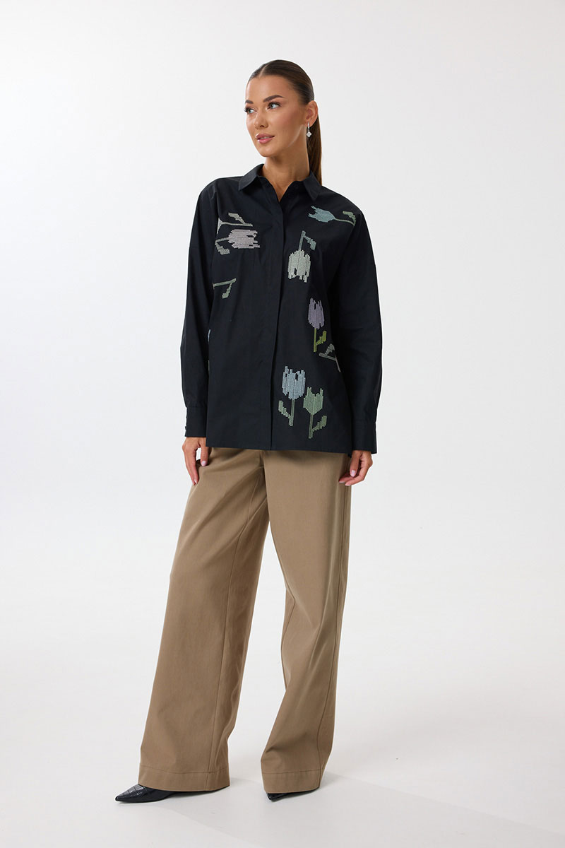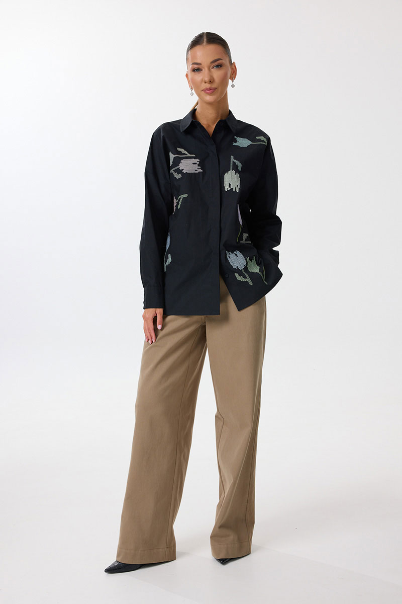 Блузка женская прямого силуэта. Перед с центральной застежкой на петли и пуговицы, декорирован авторской вышивкой. Спинка с кокеткой. Плечо спущено. Рукав длинный одношовный, по низу со складками. Низ рукава обработан притачной манжетой, застегивающейся на петли и пуговицы. В боковых швах обработаны разрезы. Горловина обработана воротником рубашечного типа с отрезной стойкой.