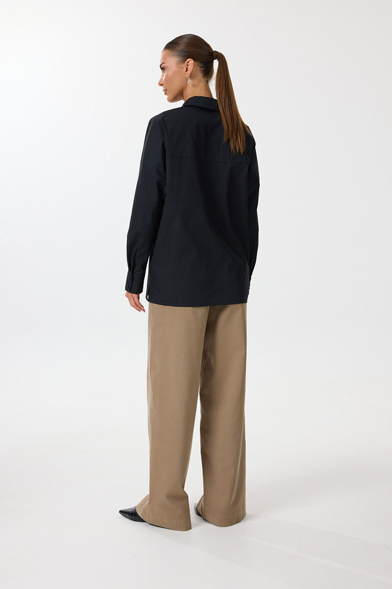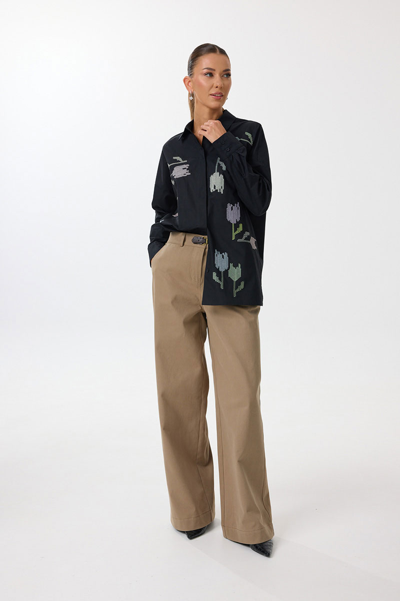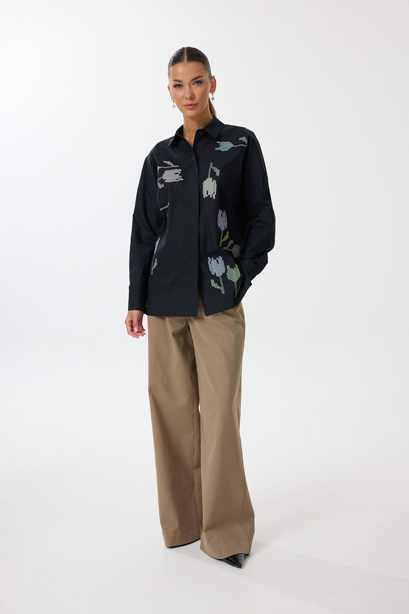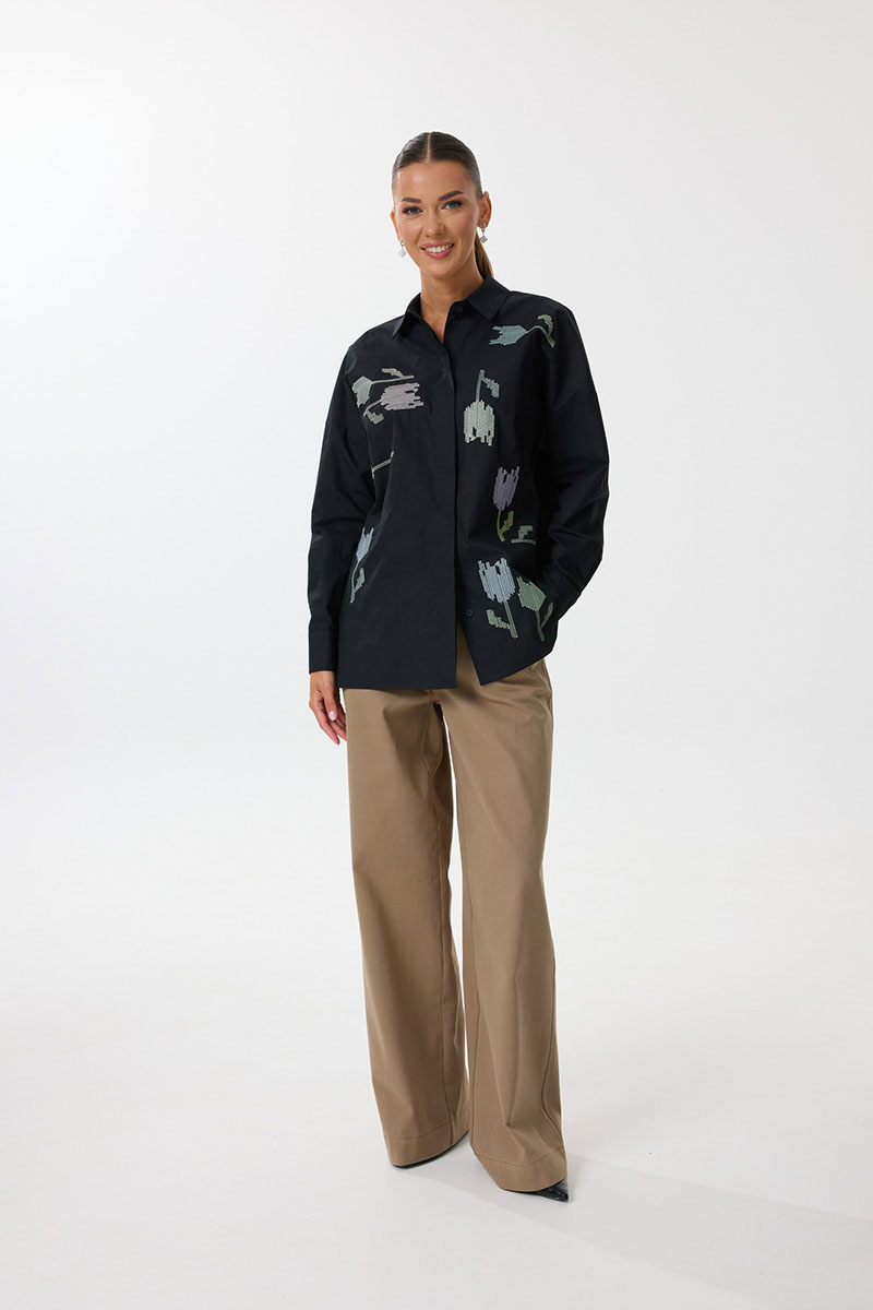 Блузка женская прямого силуэта. Перед с центральной застежкой на петли и пуговицы, декорирован авторской вышивкой. Спинка с кокеткой. Плечо спущено. Рукав длинный одношовный, по низу со складками. Низ рукава обработан притачной манжетой, застегивающейся на петли и пуговицы. В боковых швах обработаны разрезы. Горловина обработана воротником рубашечного типа с отрезной стойкой.