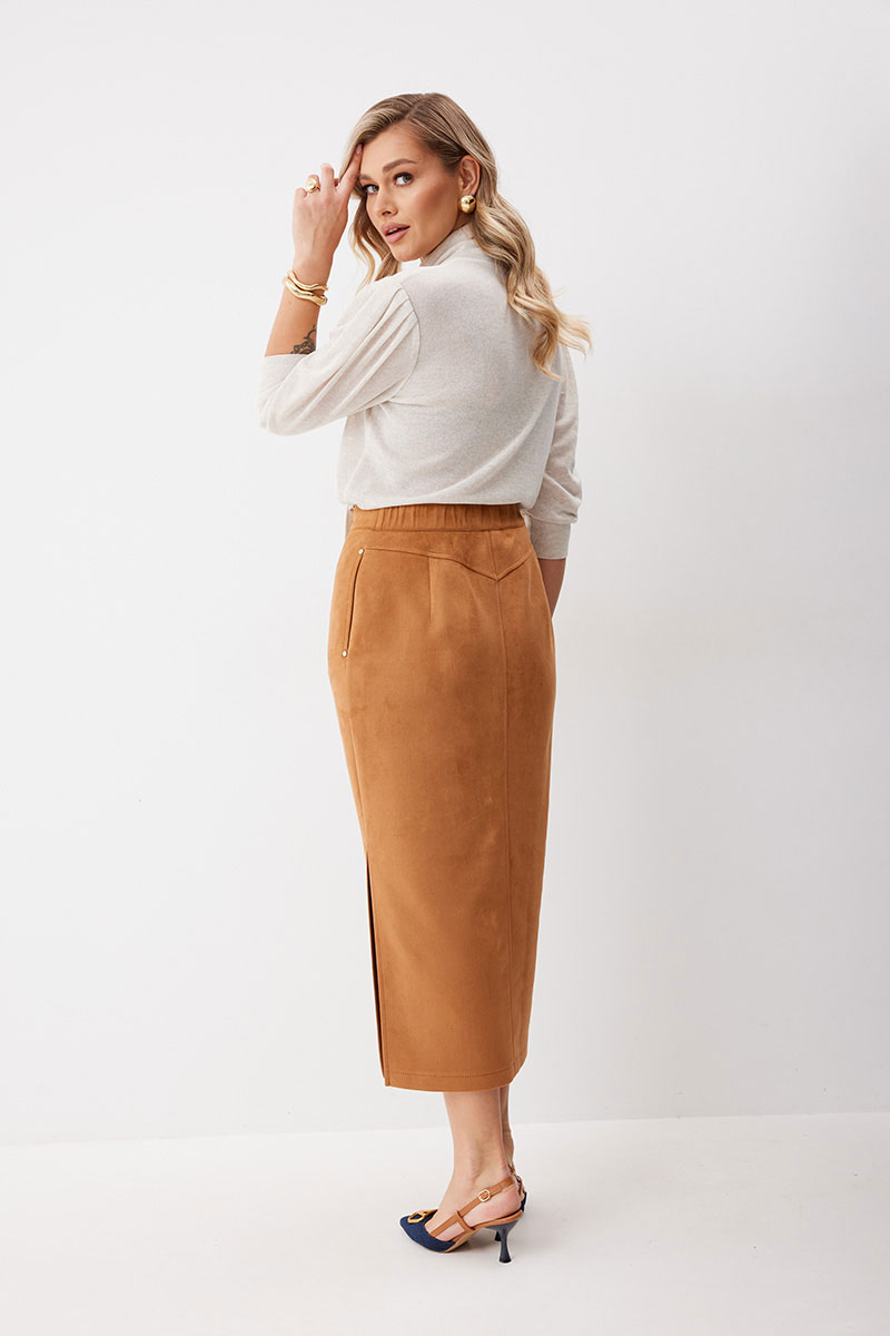 Блуза женская прямого силуэта из трикотажной ткани длиной ниже линии бедра. Горловина обработана отложной стойкой. Рукав ¾ втачной одношовный. По верху рукава заложены складки, по низу рукава притачная манжета.