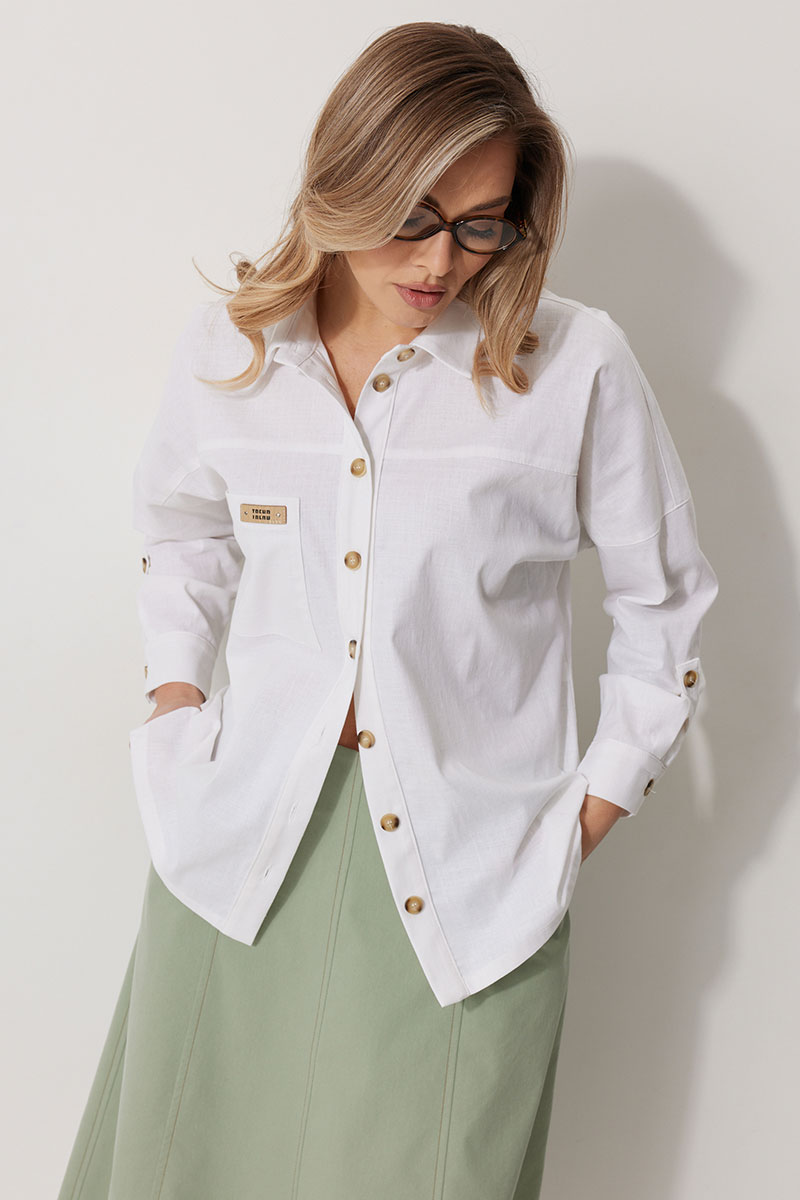 Блузка женская с рукавом и спущенной линией плеча длиной за линию бедра. По переду блузки обработана отрезная кокетка. Накладной карман расположен правой части полочки с декоративным элементом. По спинке блузки обработана отрезная кокетка. Рукав втачной рубашечный одношовный. Низ рукава со складкой, обработан притачной разъемной манжетой, застегивающаяся на петлю и пуговицу. В разрезе рукава пришита пата, застегивающаяся на пуговицу. Перед блузки обработан отрезными планками, застегивающимися на петли и декоративные пуговицы. Горловина обработана рубашечным воротником со стойкой. Подгибка низа блузки 1,5 см. По боковым швам блузки обработаны разрезы.