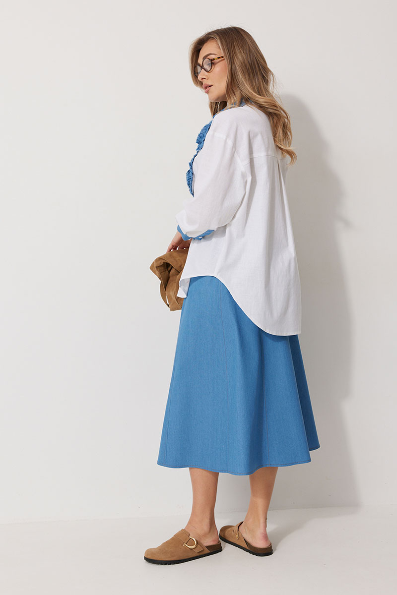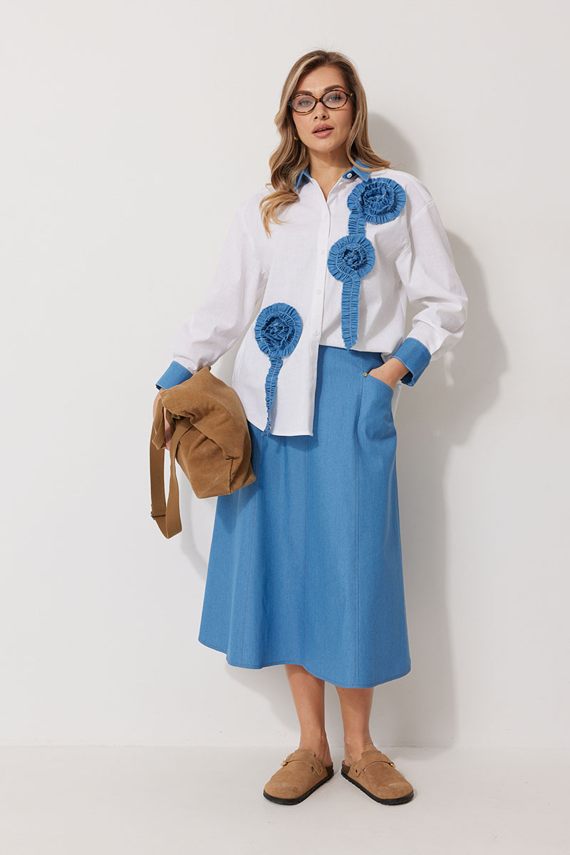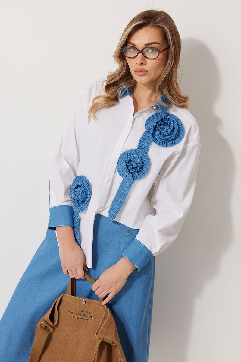 Блузка женская прямого силуэта. По переду обработана кокетка, цельнокроеная с кокеткой спинки. На полочках располагается не съемный декор из цветка, выполненный из отделочной ткани. Детали полочек с цельнокроеными планками застегивающимися на петли и пуговицы. По верху спинки заложена бантовая складка и притачная кокетка. Плечо спущено. Рукав длинный, по низу 2 складки и притачная манжета, застегивающейся на петли и пуговицы из отделочной ткани. Разрез рукава обработан притачными планками из отделочной ткани. Низ разноуровневый, закругленной формы. Горловина обработана воротником рубашечного типа с отрезной стойкой из отделочной ткани.