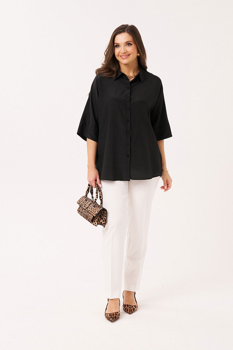 Блузка женская из смесовой ткани с большим содержанием хлопка для повседневной носки. Застежка центральная бортовая на обметанные петли и пуговицы. В боковых швах имеются небольшие разрезы. Горловина обработана рубашечным воротником с отрезной стойкой. Рукава цельнокроеные, длина чуть ниже локтя, низ рукава обработан притачной манжетой. Красивая и легкая блузка станет не заменимой вещью в вашем гардеробе.