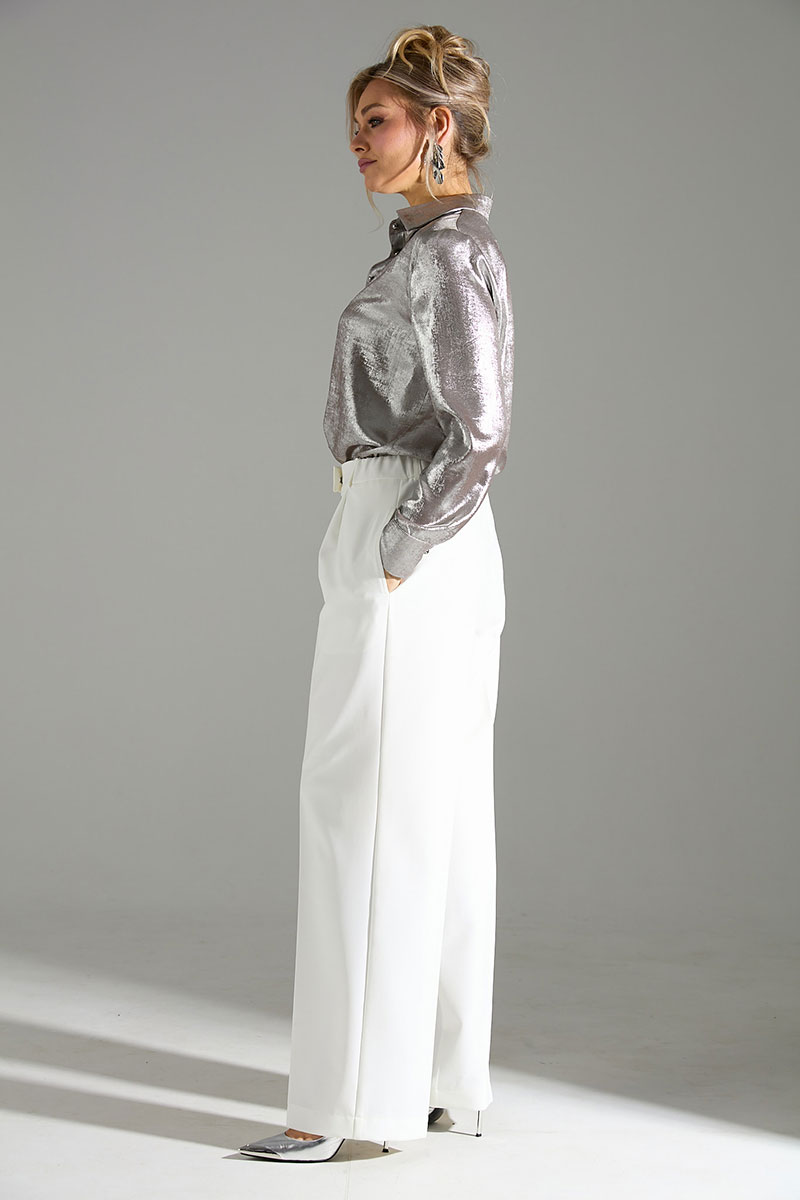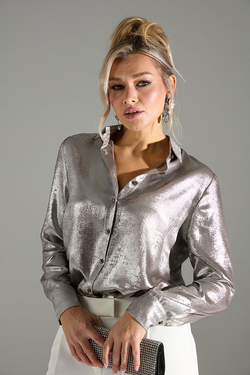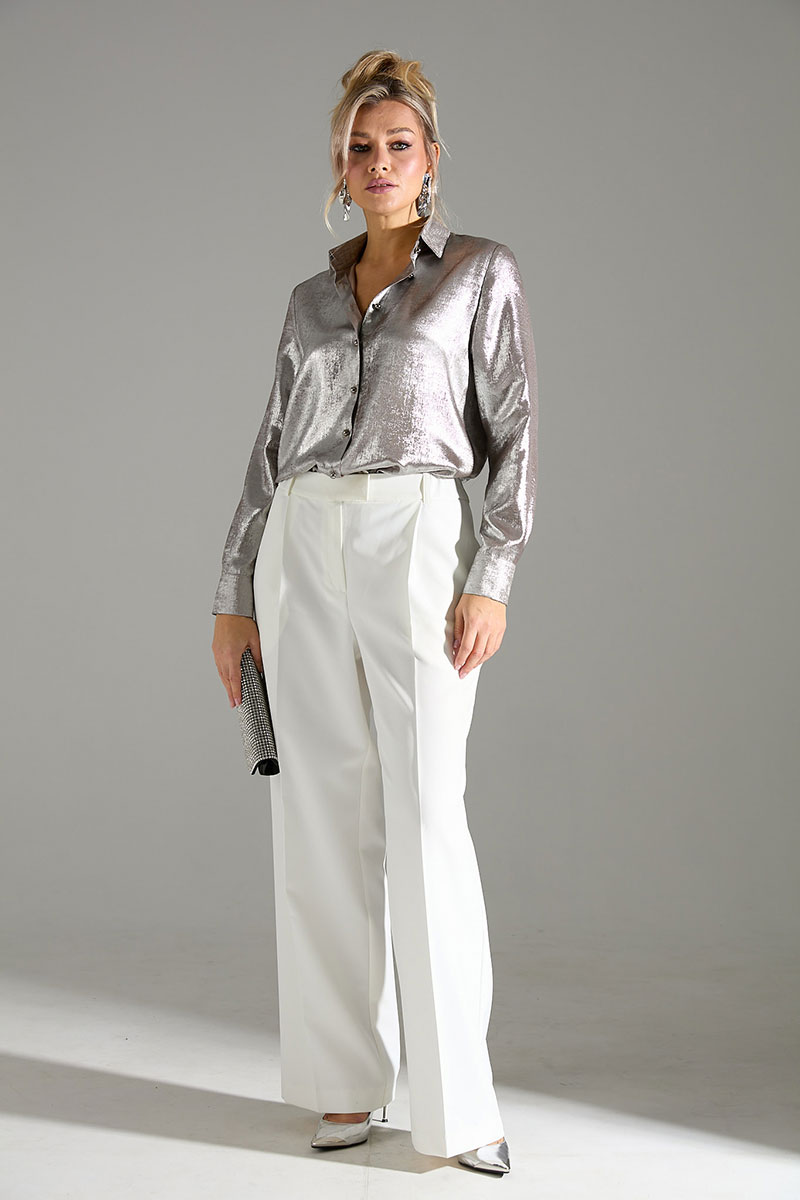 Блузка прямого силуэта из ткани с приятной к телу ткани с вискозной изнанкой и блестящей лицевой стороной. Воротник рубашечного типа, застежка на прорезные петли и пуговицы. В нижней части рукава заложены складки, манжета на двух пуговицах.