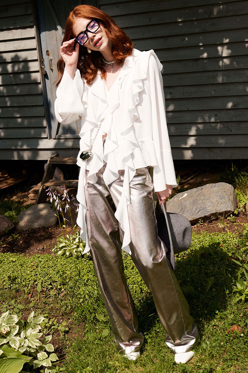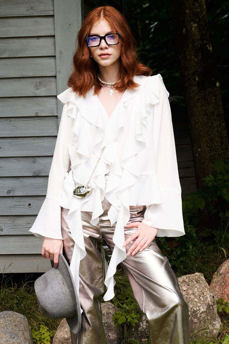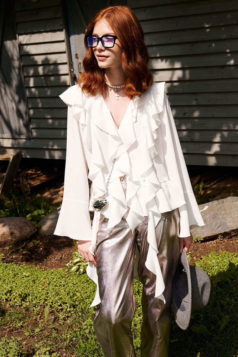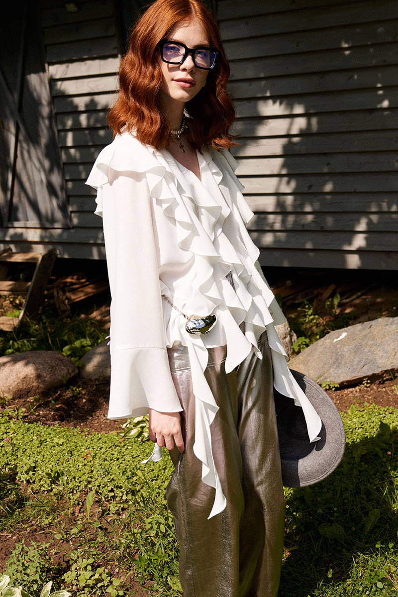 Блуза выполнена из нежной кремовый ткани. Рукав втачной по низу рукава притачной волан. У- образный вырез горловины, застёжка в стык на навесные петли и пуговицы. По горловине спинки и переда вшит волан. По переду и спинке вертикальные рельефы от плеча до низа блузы в которые вшиты воланы.