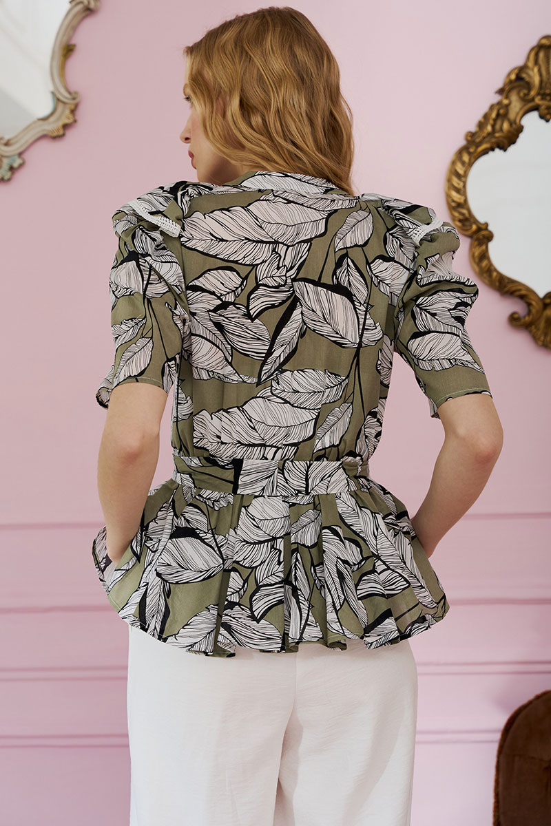 Блуза полуприлегающего силуэта, выполнена из хлопковой ткани. Рукав втачной, по верхней части рукава сборка. По переду притачная планка с воланом, по отлету волана вшито кружевная тесьма. У-образный вырез горловины, застёжка центральная на петли и пуговицы. Линия талии отрезная, в шов подреза вшит отлетной пояс. Нижняя часть блуза- "баска", по талии собрана на сборку.