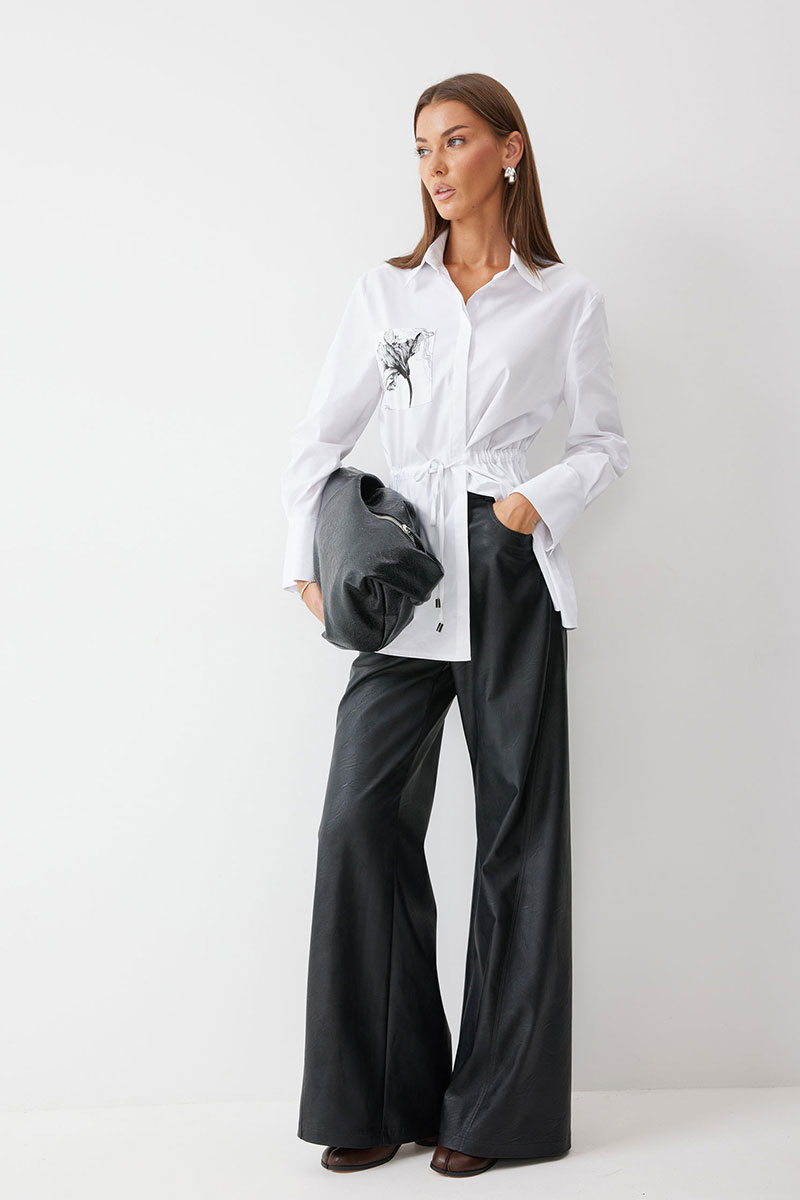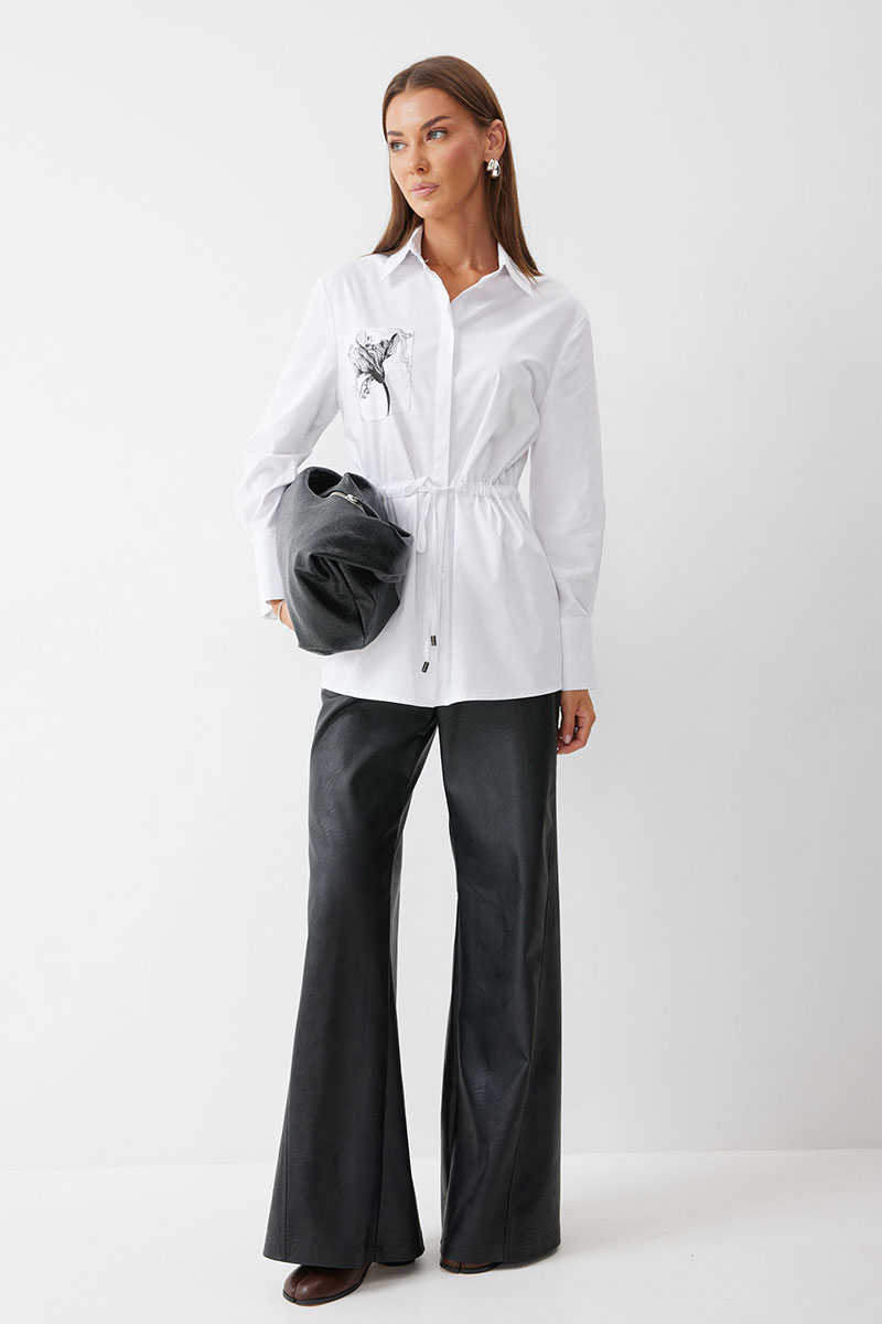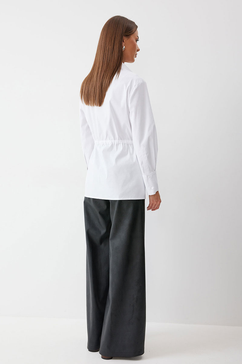 Блузка полуприлегающего силуэта. На уровне талии расположена кулиска с  и завязками для регулирования степени прилегания. По центру супатная застежка, воротник рубашечный стояче-отложной. Рукав втачной. В верхней части полочки расположен накладной карман с дизайнерской печатью.