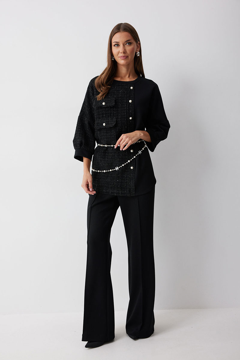 Джемпер полуприлегающего силуэта, скомбинированный из трикотажного полотна и ткани. Рукав втачной, длиной до локтя, на манжете из трикотажного полотна. Горловина округлая. Низ – фигурный. По переду декоративная планка и два кармана: накладной с клапаном функциональный, и декоративный нефункциональный клапан.