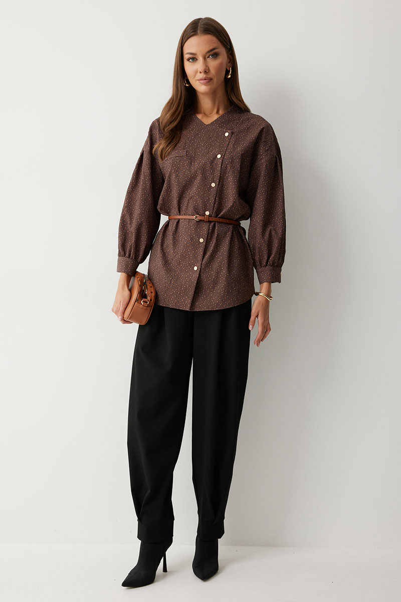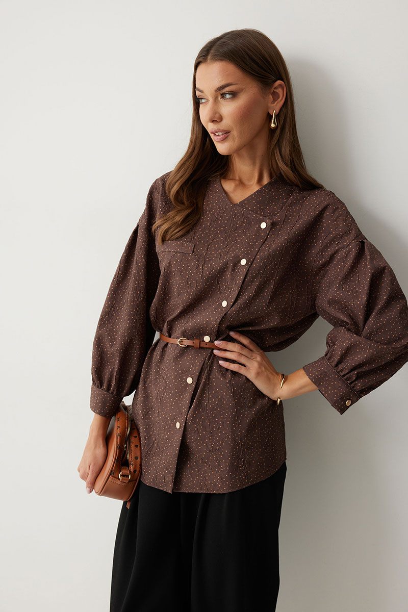 Ассиметричная блузка прямого силуэта. Низ фигурный. Рукав, спущенный с встречной складкой по центру. По низу манжета с застежкой на кнопку. По переду декоративная настрочная листочка. Ассиметричная двубортная  застежка на кнопки. Воротник-стойка. Обращаем ваше внимание, что фурнитура может незначительно отличаться от фото.