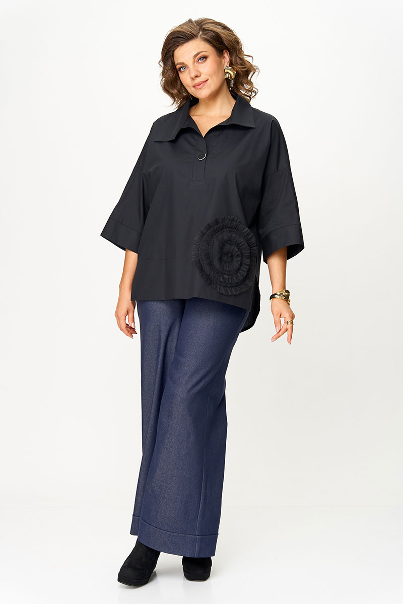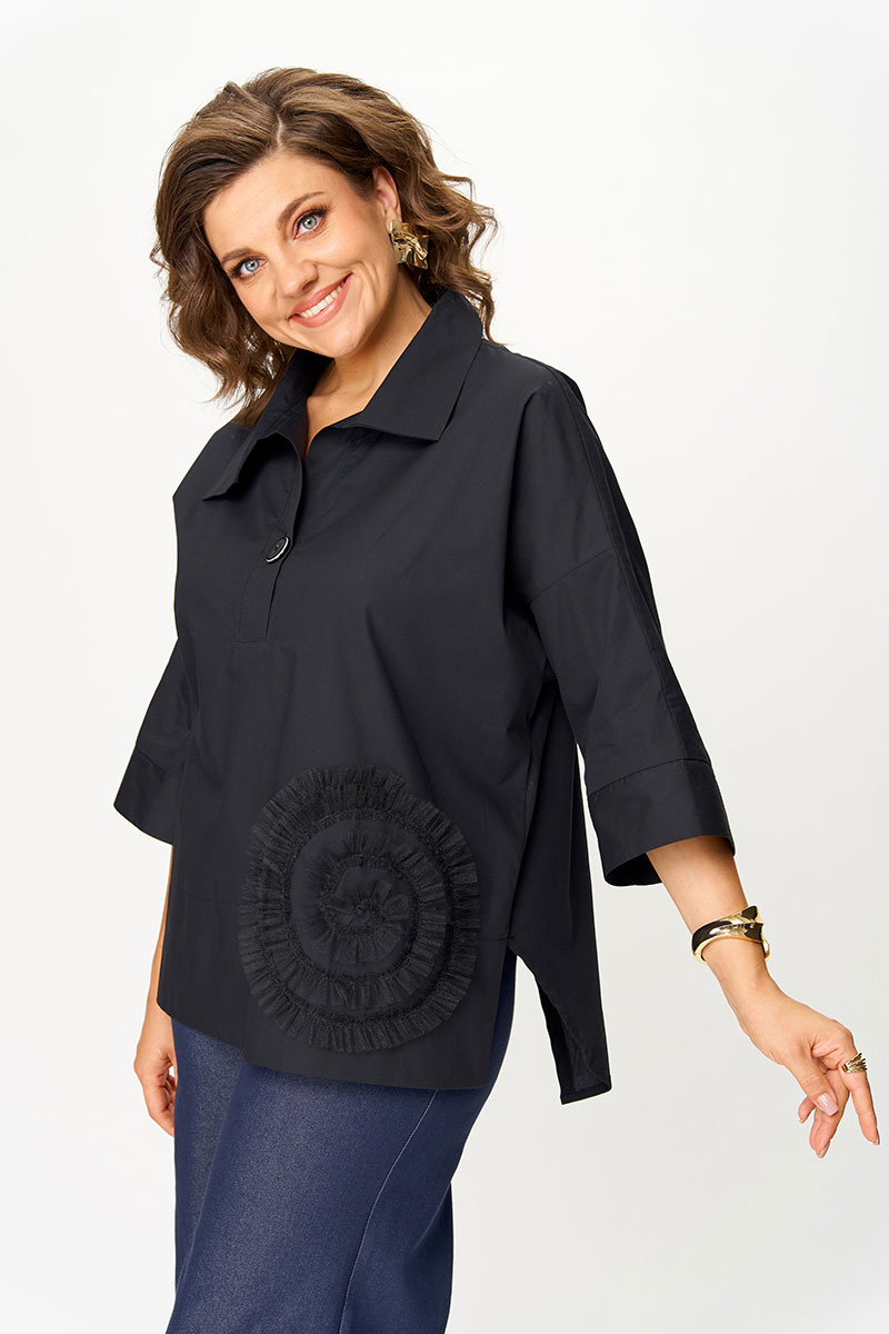 Женская хлопковая блуза в стиле «бохо» прекрасно вольется в повседневную жизнь и станет одной из любимых базовых вещей в Вашем гардеробе. Блуза свободного кроя. Перед цельный с планкой-застежкой до груди. Спинка с плечевой кокеткой, переходящей в рукав. Рукав 3/4 с притачной манжетой по низу. Из-под кокетки спинки — запах из двух нижних деталей блузы, фигурный низ, по бокам изделия разрезы. По низу переда широкая подгибка. Декорирована блуза настрочным цветком из сетки. Изделие хорошо сочетается как с брюками, так и с юбками, с классической и спортивной обувью.