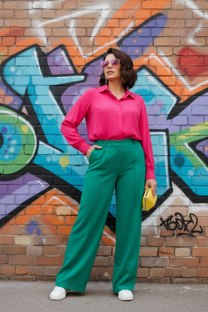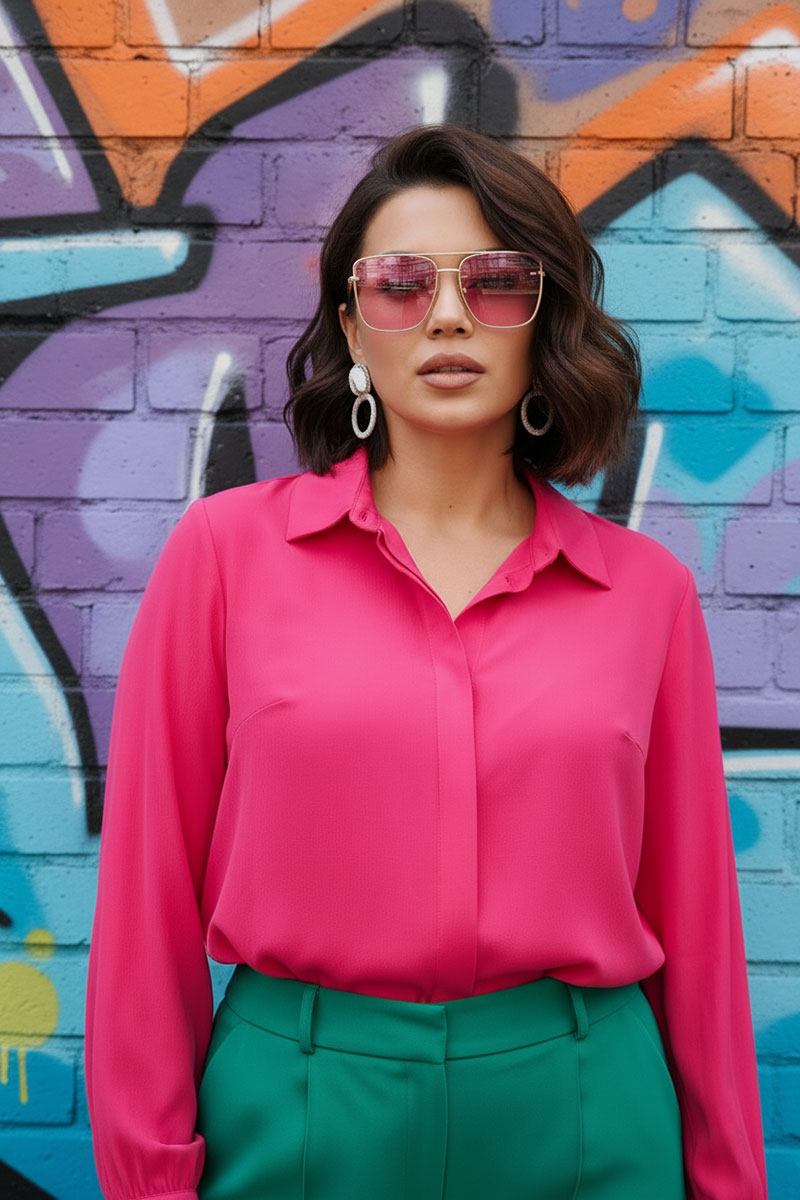 Блуза свободного силуэта. По переду планка с потайной застёжкой на семь прорезных петель и пуговиц. По спинке кокетка со сборкой. Рукава одношовные втачные, на широкой манжете с двумя складками. Воротник отложной на стойке. Боковые швы блузы заканчиваются небольшими разрезами