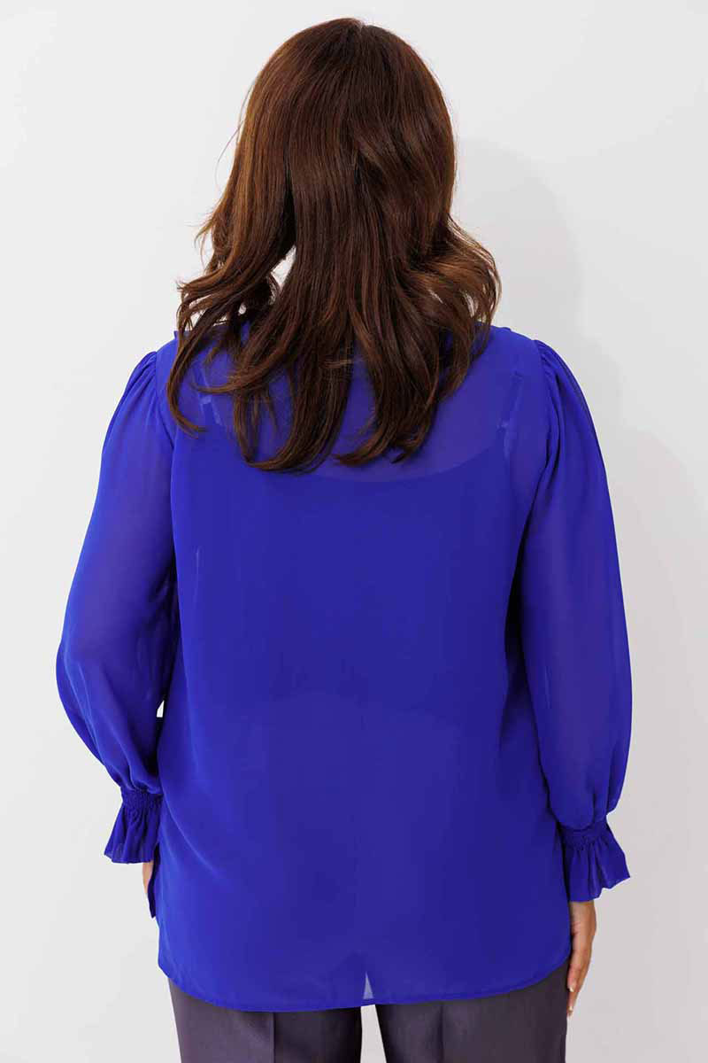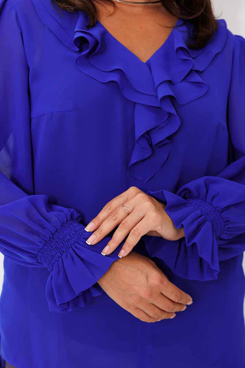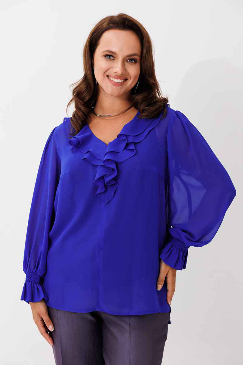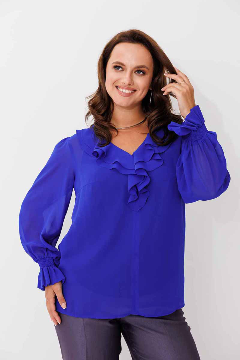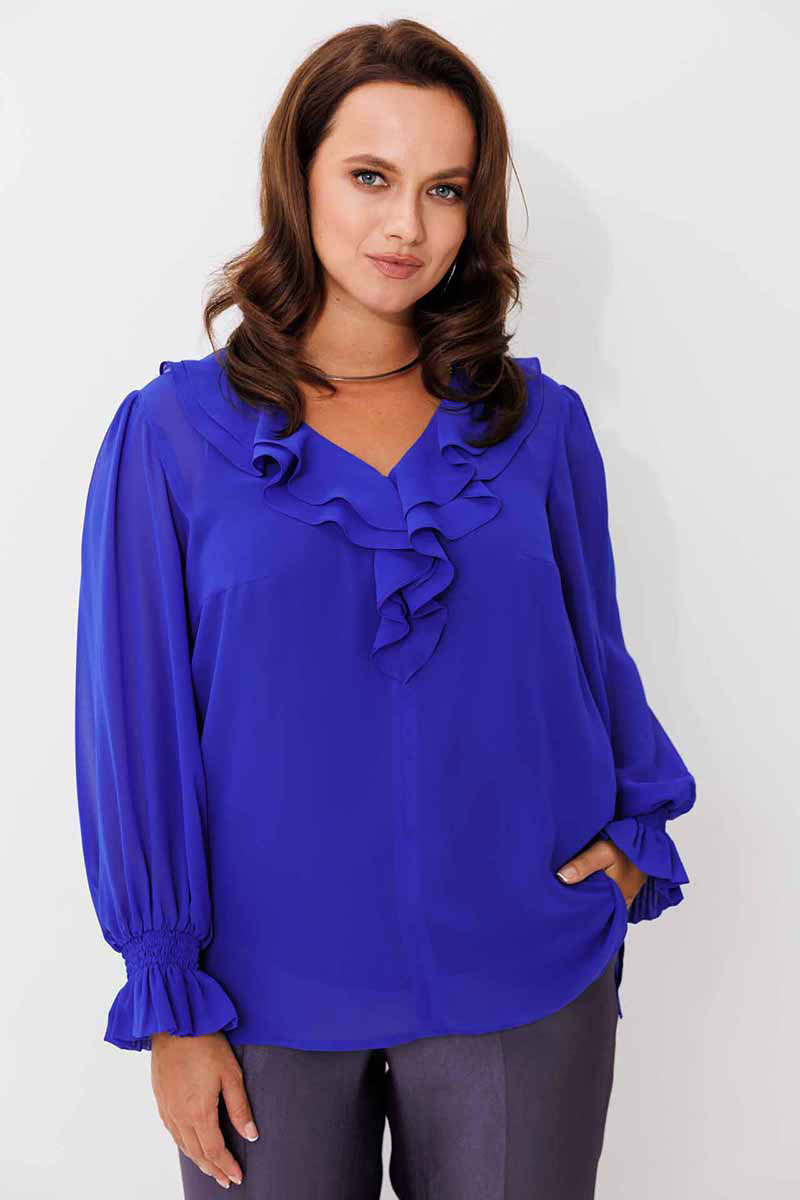 Блуза женская, рукав втачной со сборкой по окату. Рукав расширяется к низу. V-образный вырез с двойным воланом. Низ рукава обработан манжетой на венгерке. В комплекте топ из хлопка (100%) на регулируемых бретелях.