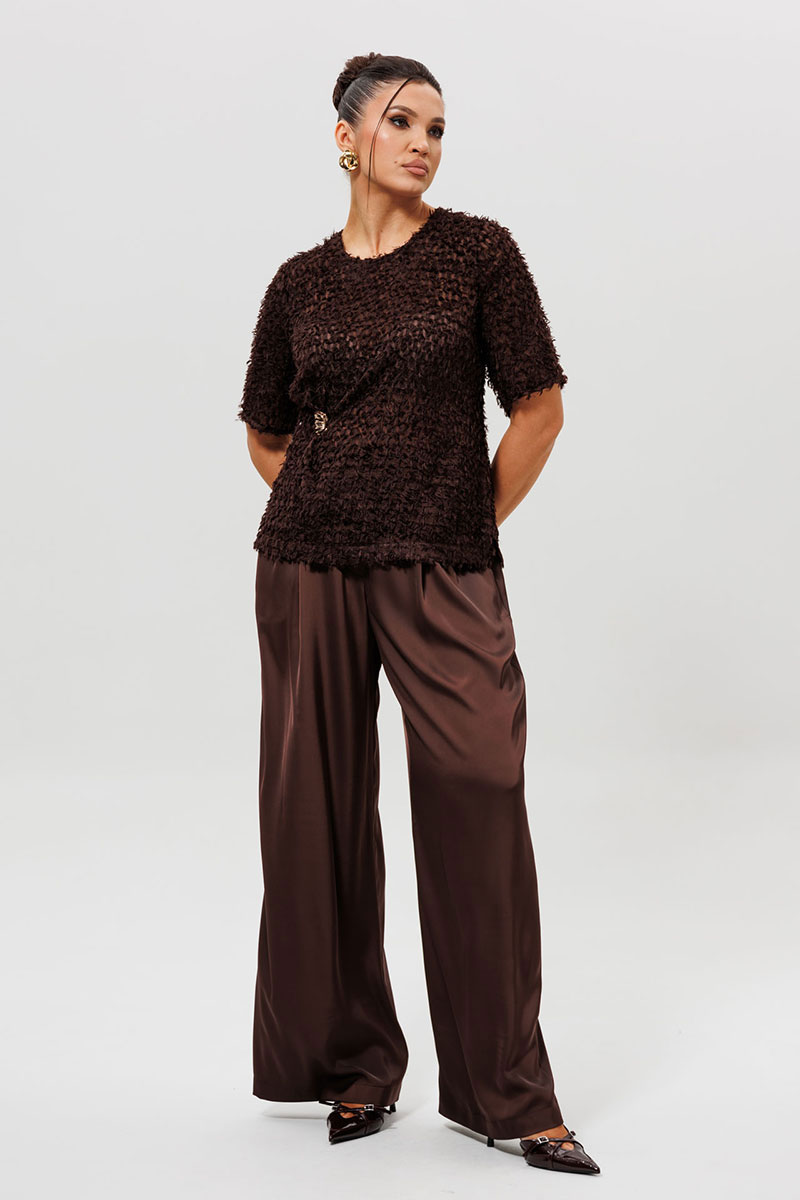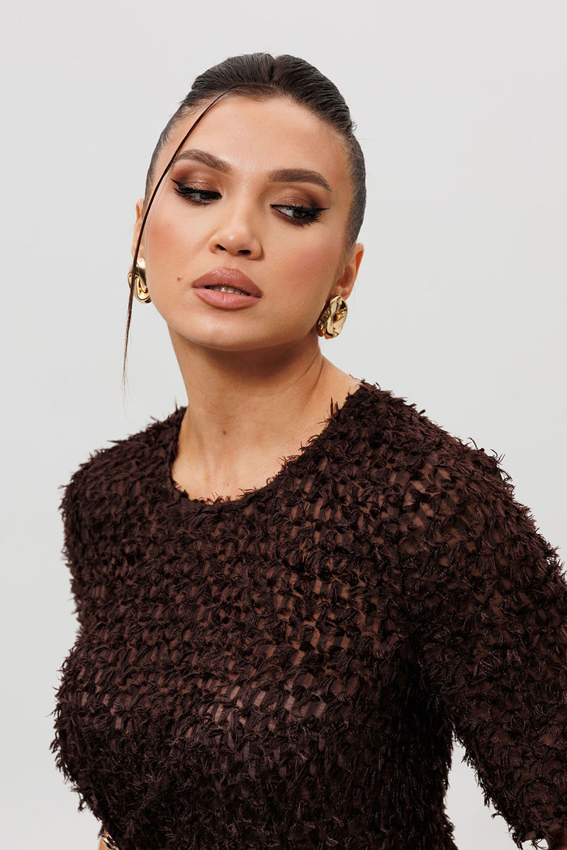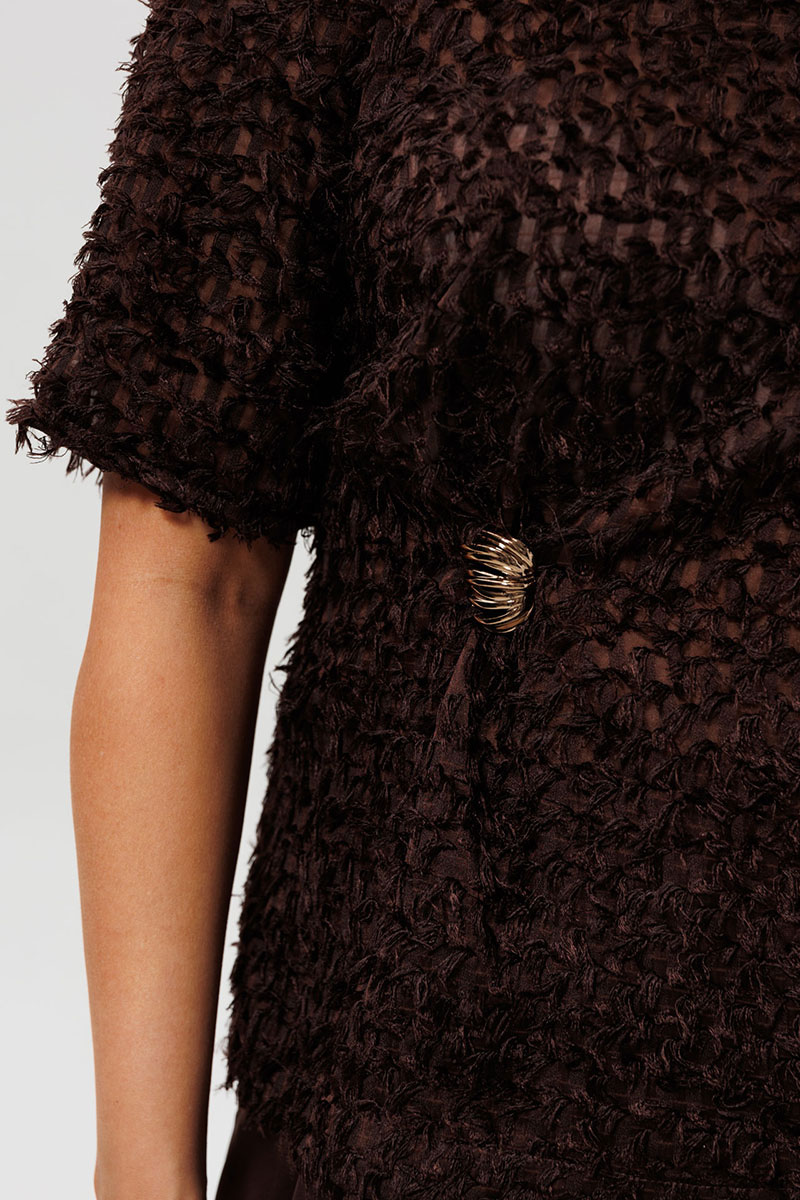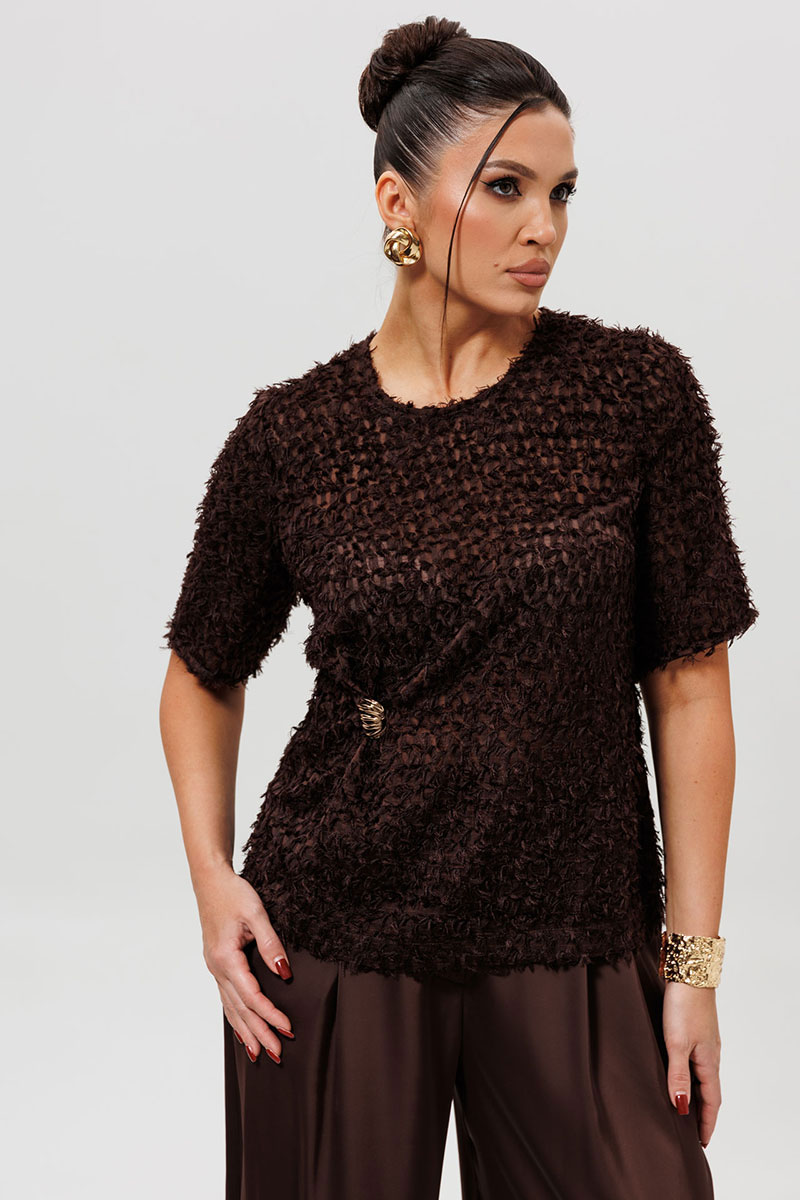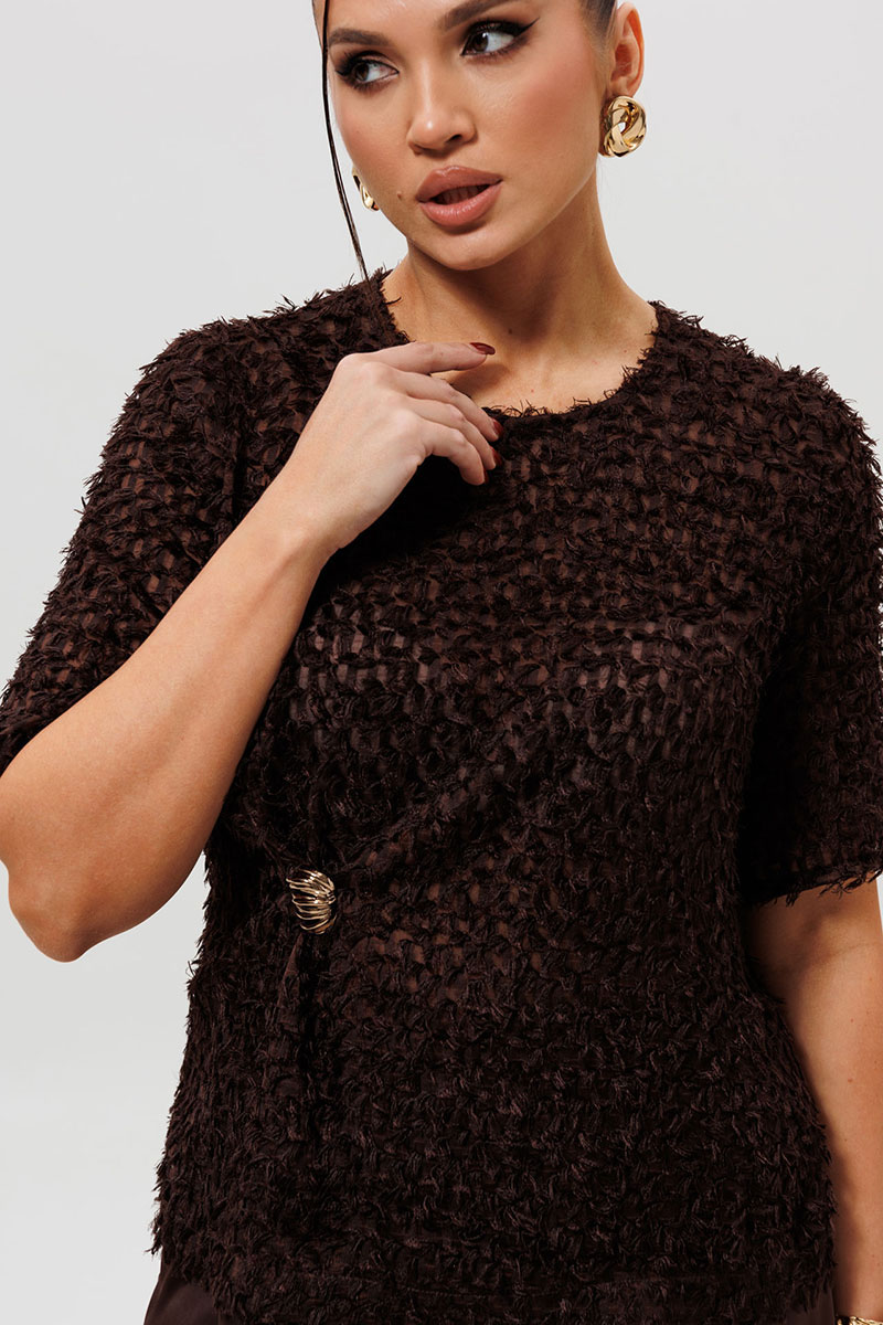 Блуза представлена в трендовом шоколадном оттенке, выполнена из лёгкой ткани травка на шифоновой основе, прямого силуэта. Перед с нагрудными вытачками и декоративным элементом: небольшие складки, которые фиксируются пришивным декоративным элементом. На спинке обработана застёжка на петлю и пуговицу. Рукав втачной. Эта коричневая блузка из ткани-травка — образец уникального дизайна и внимания к деталям. Модель с коротким рукавом украшена изящной золотой пришивной брошью и изысканной сборкой на боку, создающей мягкий объем. Особенность фасона — элегантная застежка-капелька на пуговице на спинке, которая добавляет образу индивидуальности. Блузка выполнена из фактурной ткани, которая выглядит дорого и современно. Идеальный выбор для офиса, деловой встречи или романтического ужина, чтобы подчеркнуть ваш безупречный вкус.