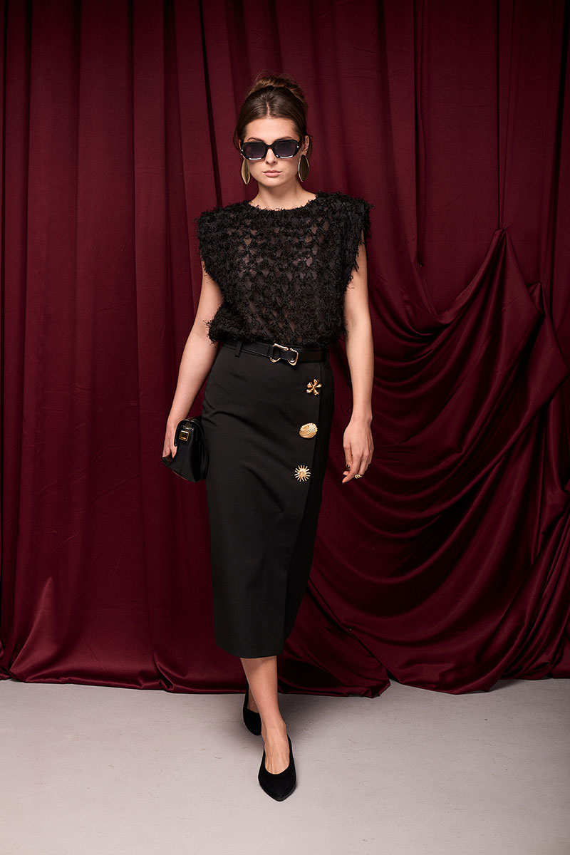 Блуза из фактурной дизайнерской ткани. Усиленная линия плеча.