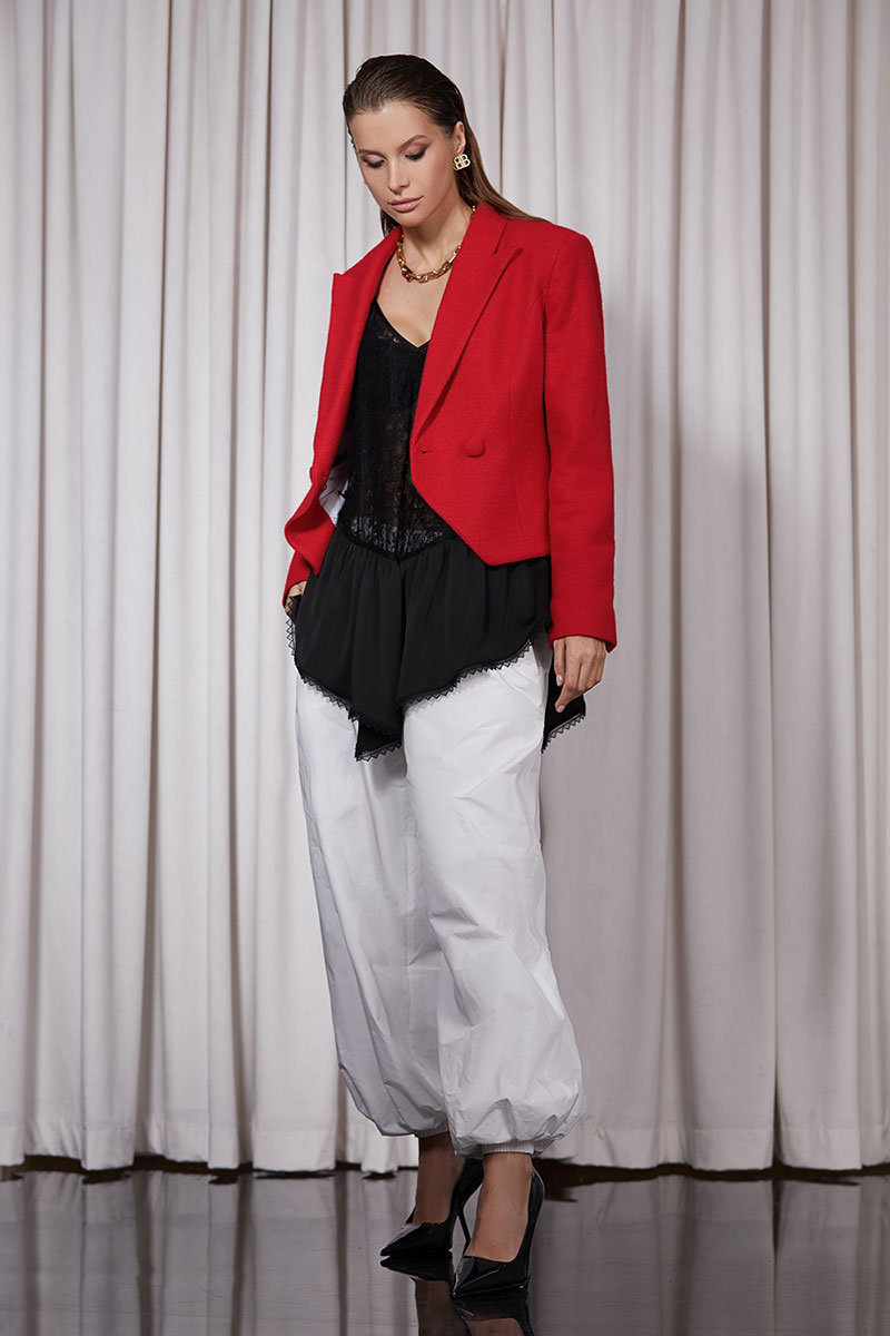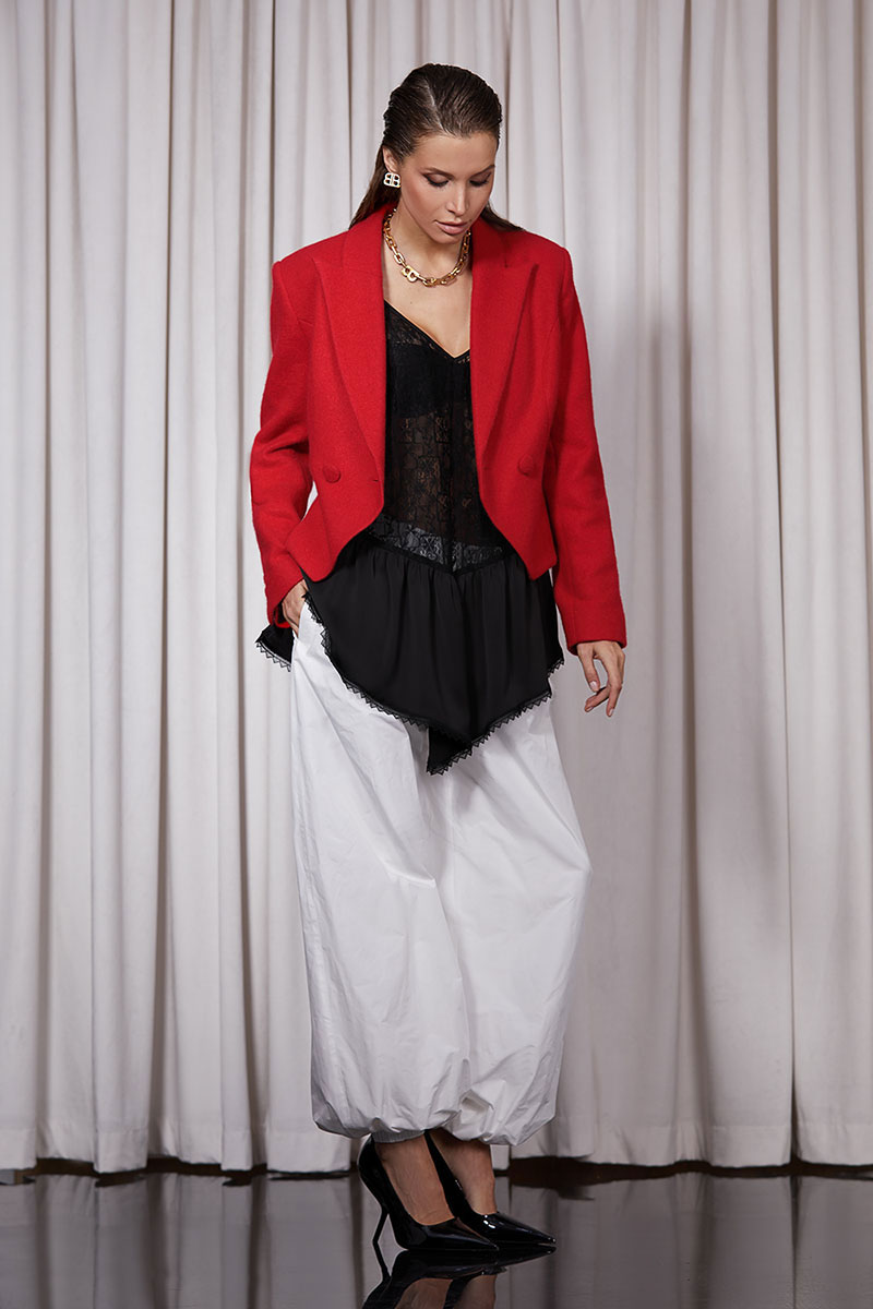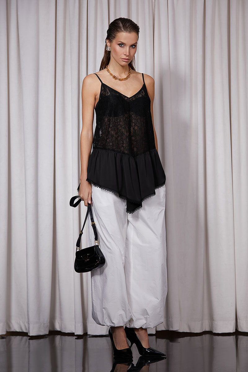 Блуза прямого силуэта, выполнена из кружева. Изделие на регулируемых бретелях. Низ ассиметричный.