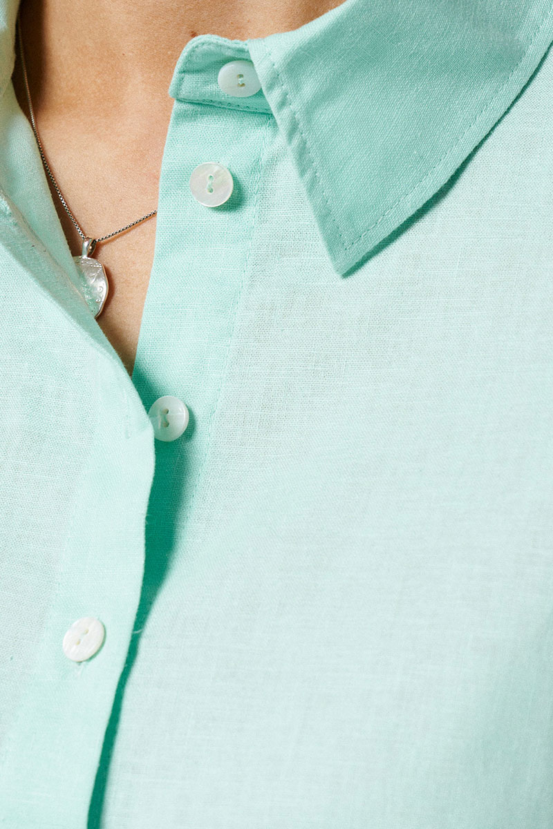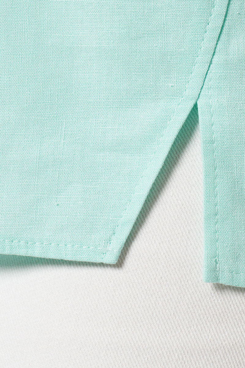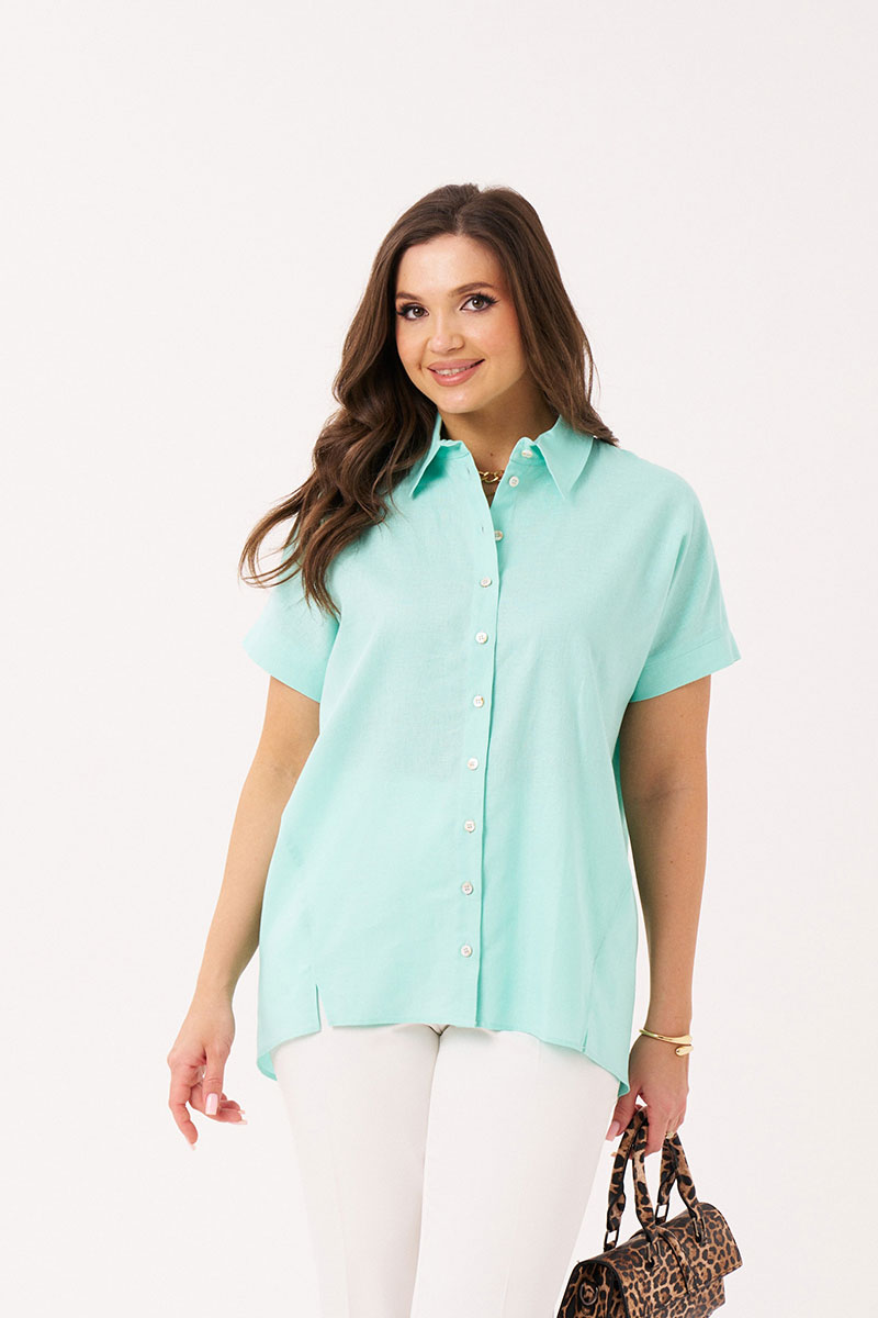 Блуза женская из льняной ткани для повседневной носки. Блуза прямого силуэта с коротким цельнокроеным рукавом. По спинке притачной волан. Горловина изделия круглая. Длина классическая.
