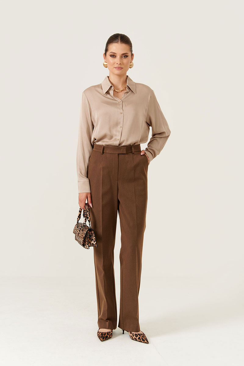 Эта стильная женская блузка бежевого оттенка идеально подойдет для повседневной носки. Выполненная в прямом силуэте, она обеспечивает комфорт и свободу движений. Ткань поливискозная, струящаяся, что придает изделию легкость и изящность. Перед украшен центральной бортовой застежкой на обметанные петли и пуговицы, а низ изделия выполнен с закругленным краем, добавляя изящества образу. Горловина оформлена классическим рубашечным воротником, а рукава завершены притачными манжетами с застежками на две обметанные петли и пуговицы — практично и стильно. Эта очень легкая и практичная блузка станет отличным выбором для ежедневных образов, сочетая комфорт с элегантностью и привлекательностью.
