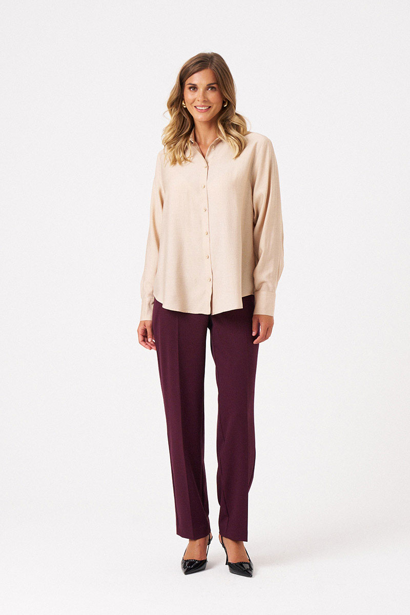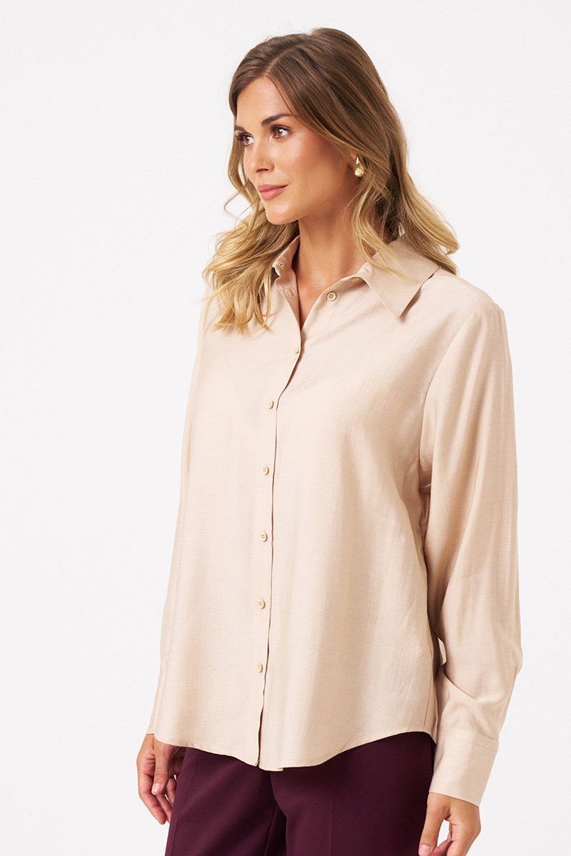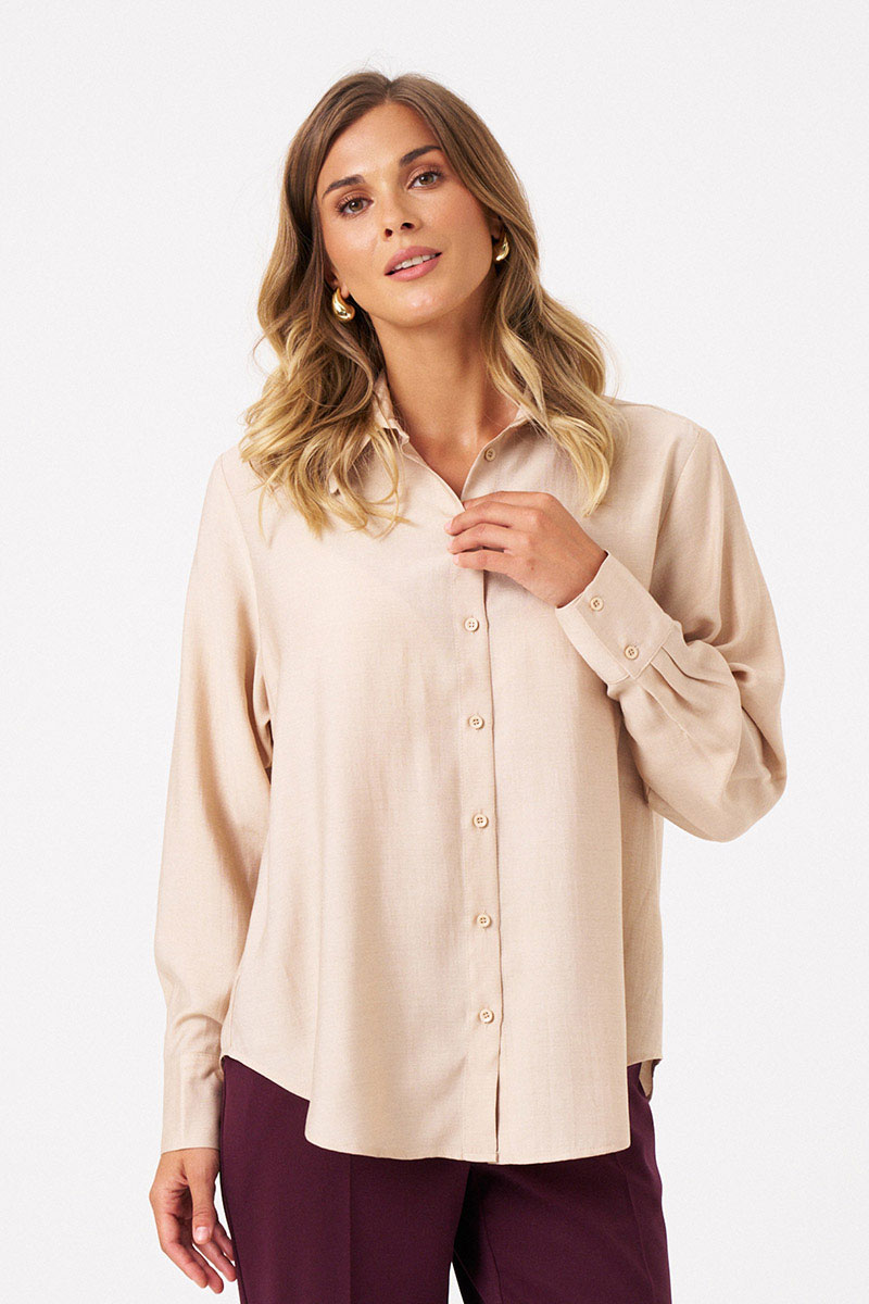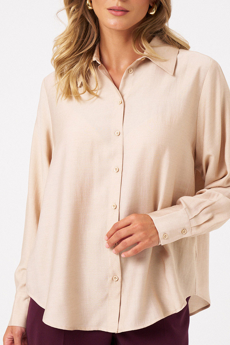 Эта стильная женская блузка бежевого оттенка идеально подойдет для повседневной носки. Выполненная в прямом силуэте, она обеспечивает комфорт и свободу движений. Ткань поливискозная, струящаяся, что придает изделию легкость и изящность. Перед украшен центральной бортовой застежкой на обметанные петли и пуговицы, а низ изделия выполнен с закругленным краем, добавляя изящества образу. Горловина оформлена классическим рубашечным воротником, а рукава завершены притачными манжетами с застежками на две обметанные петли и пуговицы — практично и стильно. Эта очень легкая и практичная блузка станет отличным выбором для ежедневных образов, сочетая комфорт с элегантностью и привлекательностью.