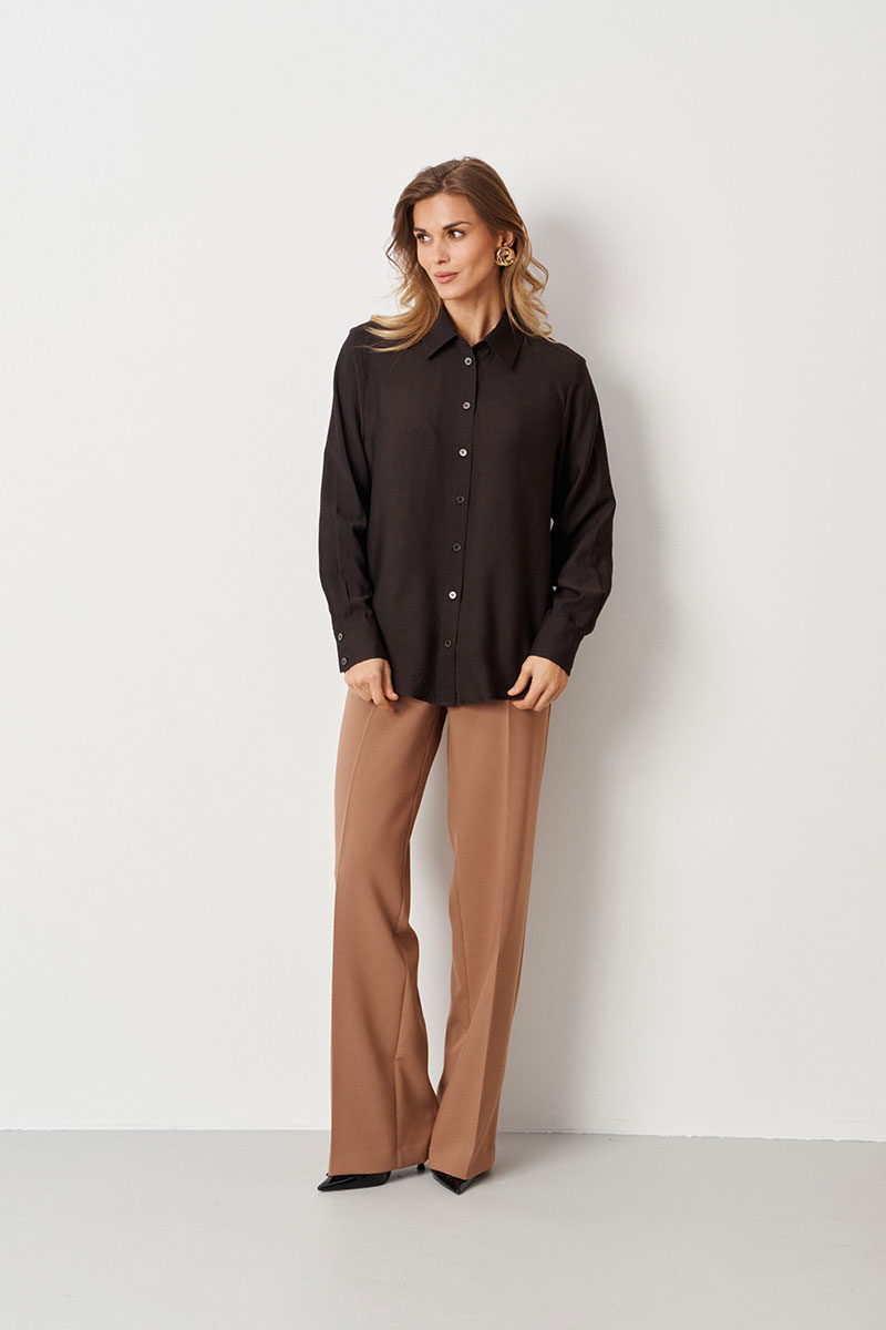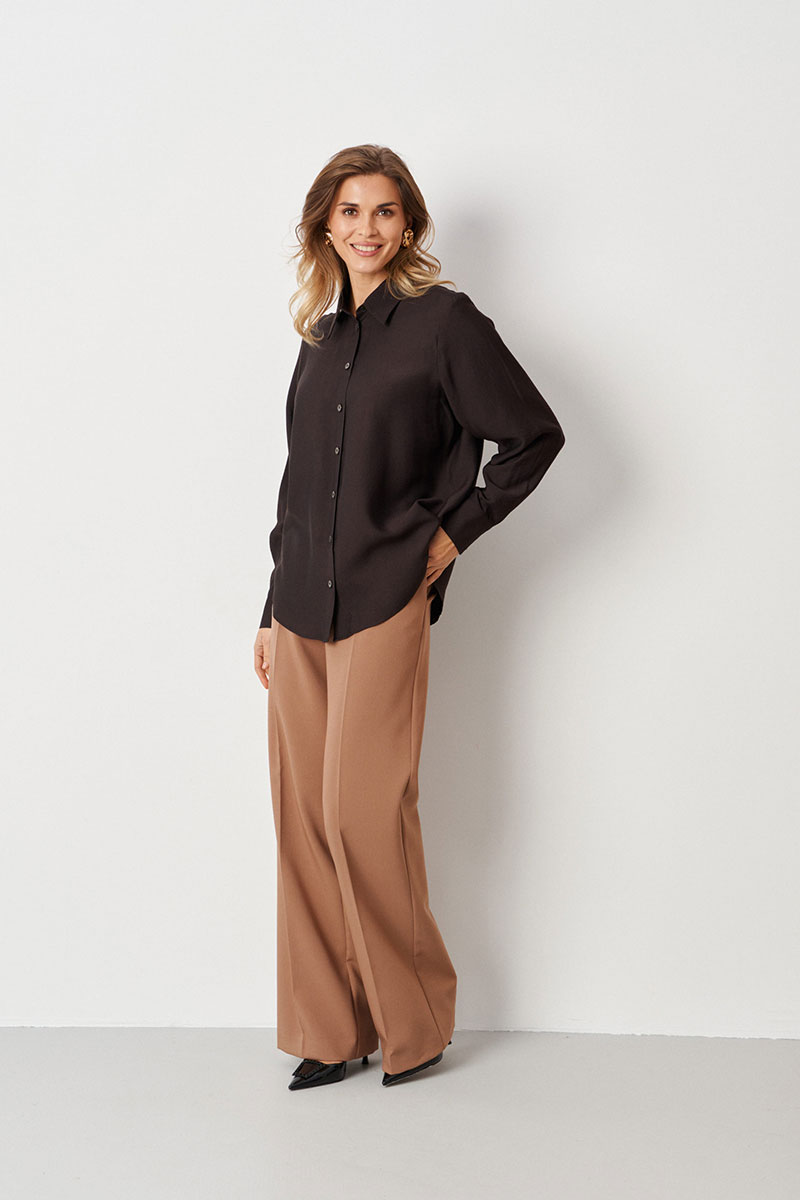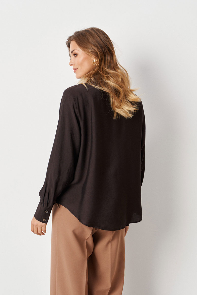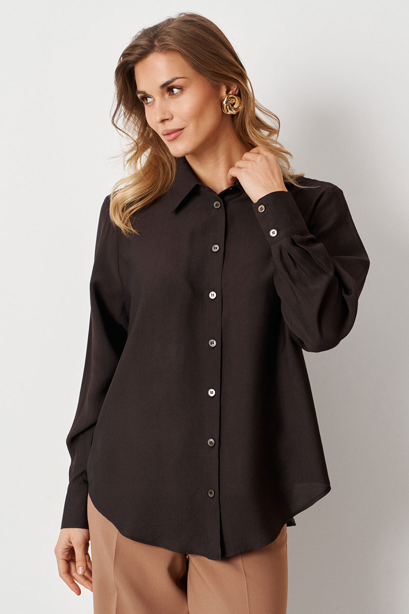 Эта стильная женская блузка идеально подойдет для повседневной носки. Выполненная в прямом силуэте, она обеспечивает комфорт и свободу движений. Ткань поливискозная, струящаяся, что придает изделию легкость и изящность. Перед украшен центральной бортовой застежкой на обметанные петли и пуговицы, а низ изделия выполнен с закругленным краем, добавляя изящества образу. Горловина оформлена классическим рубашечным воротником, а рукава завершены притачными манжетами с застежками на две обметанные петли и пуговицы — практично и стильно. Эта очень легкая и практичная блузка станет отличным выбором для ежедневных образов, сочетая комфорт с элегантностью и привлекательностью.