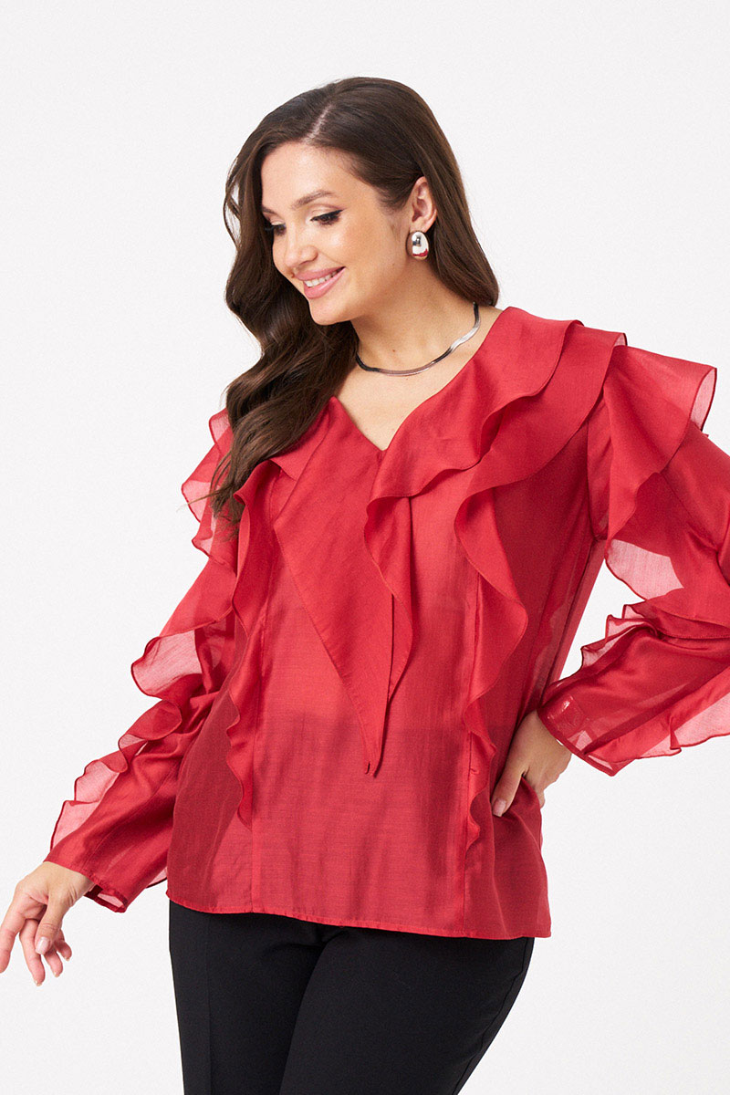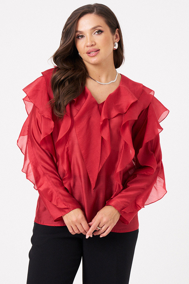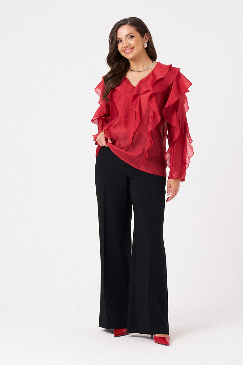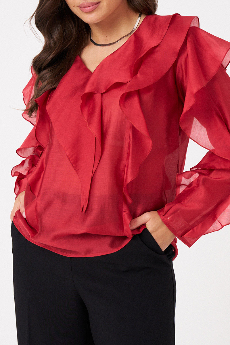 Длинные втачные рукава украшены воланами по линии проймы и вдоль рукава, создавая легкий объем и динамику движения. Такая отделка подчеркивает воздушность модели и делает ее особенно привлекательной.