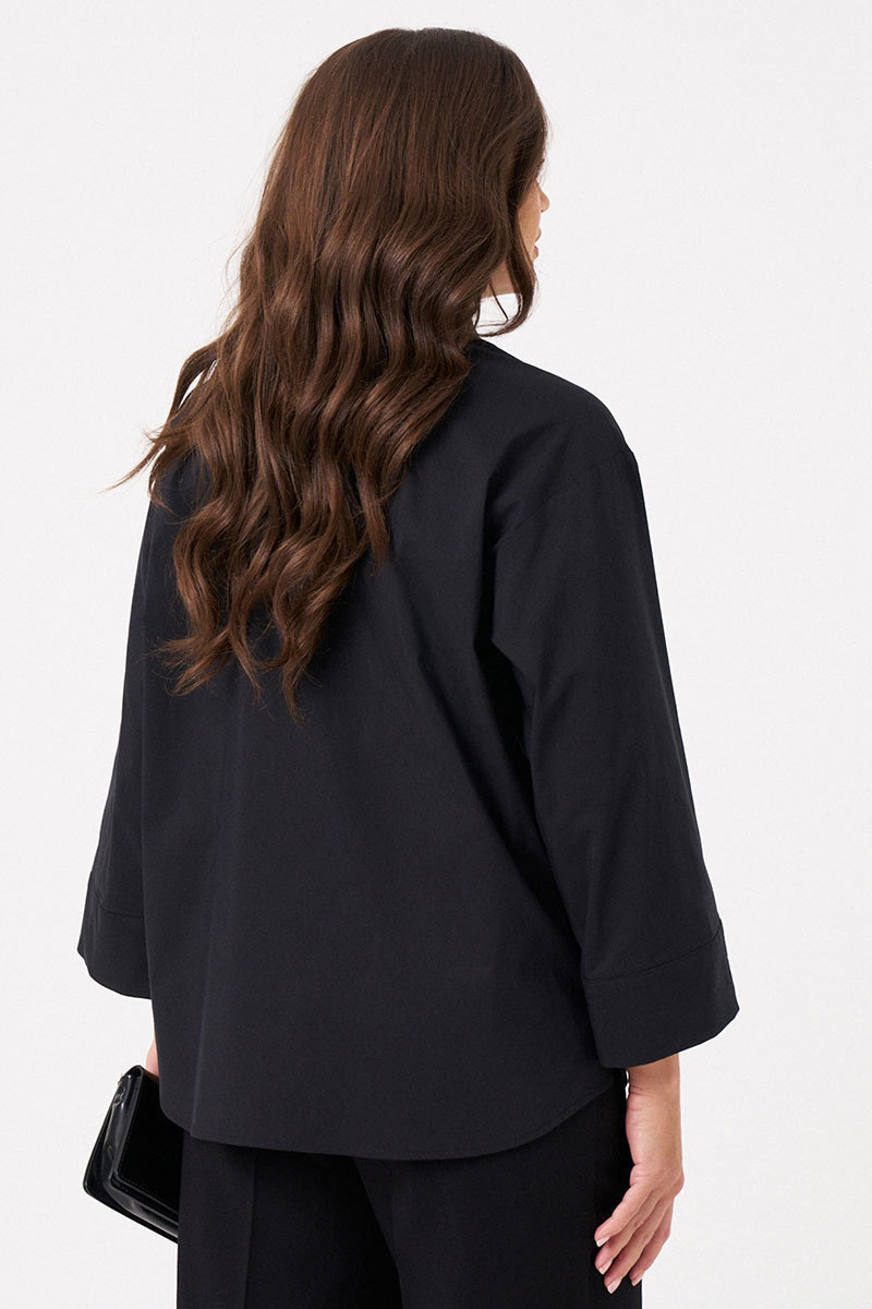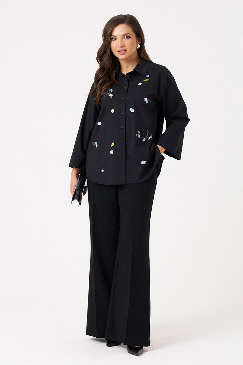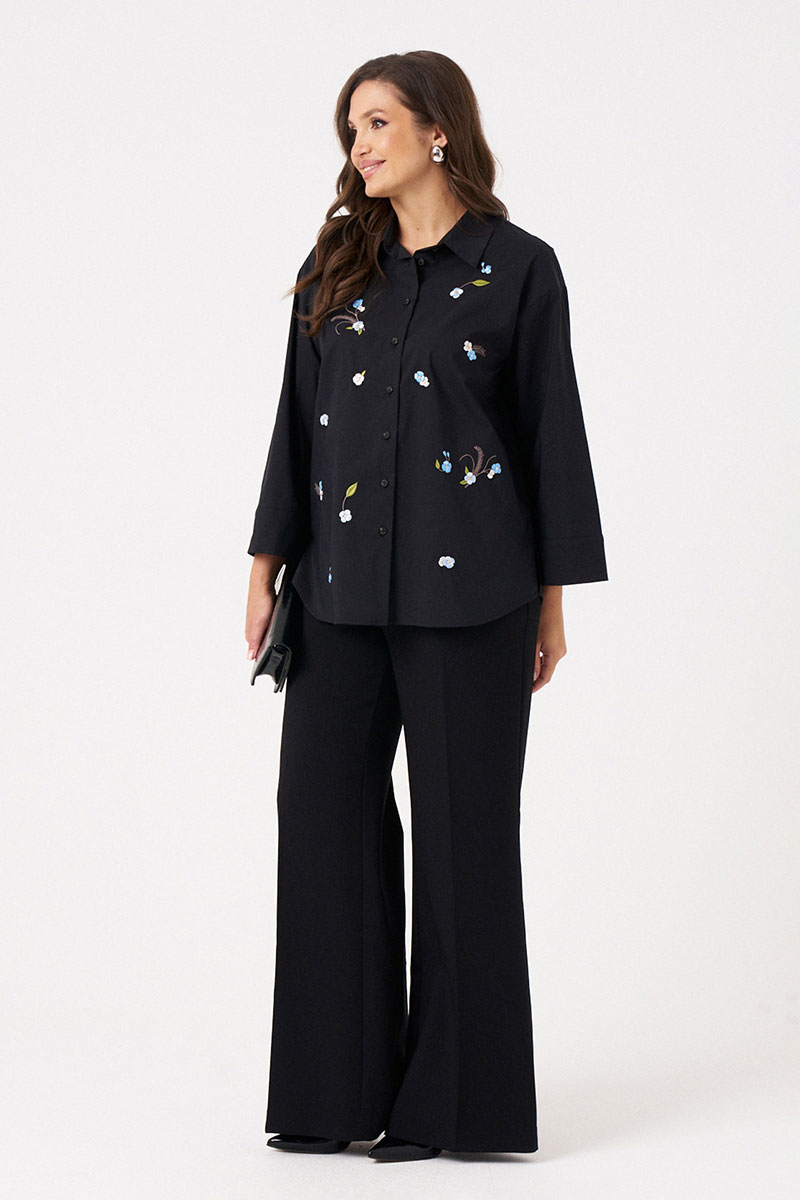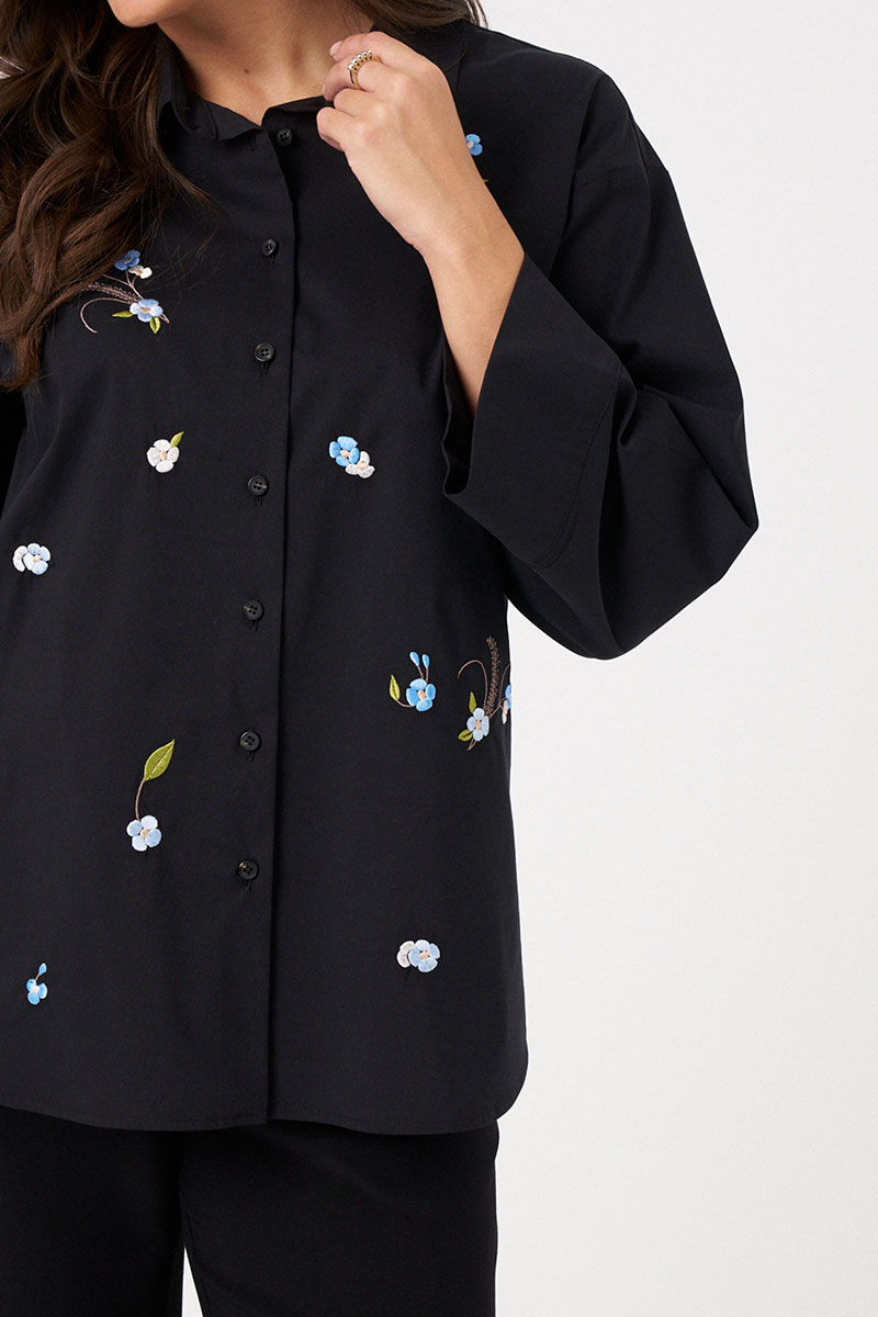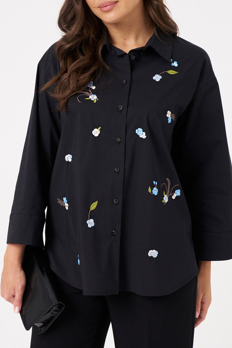Это женская блузка чёрного оттенка из смесовой ткани с высоким содержанием хлопка, обеспечивающей комфорт и приятные тактильные ощущения. Модель выполнена с центральной бортовой застежкой, закрепленной на обметанных петлях и пуговицах, что придает ей классический и аккуратный вид. Перед украшен дизайнерской вышивкой в виде цветов, что добавляет изделию оригинальности и эстетической привлекательности. В боковых швах расположены небольшие разрезы, обеспечивающие свободу движений и удобство при носке. Горловина оформлена рубашечным воротником с отрезной стойкой, создавая структурированный и элегантный силуэт. Рукава втачные длинные, низ рукава обработан притачной манжетой, что делает дизайн завершенным и практичным. Эта блузка отлично подойдет для повседневных образов, сочетая комфорт, стиль и оригинальные декоративные элементы.