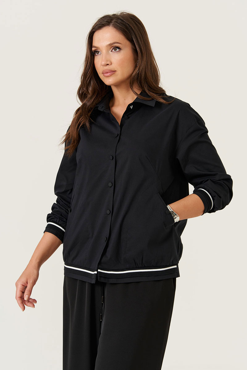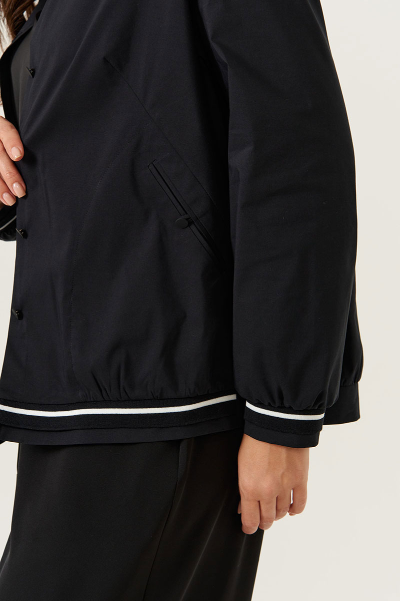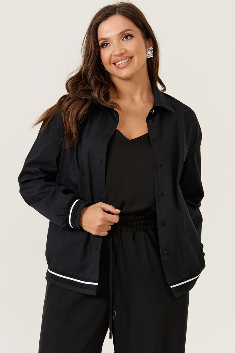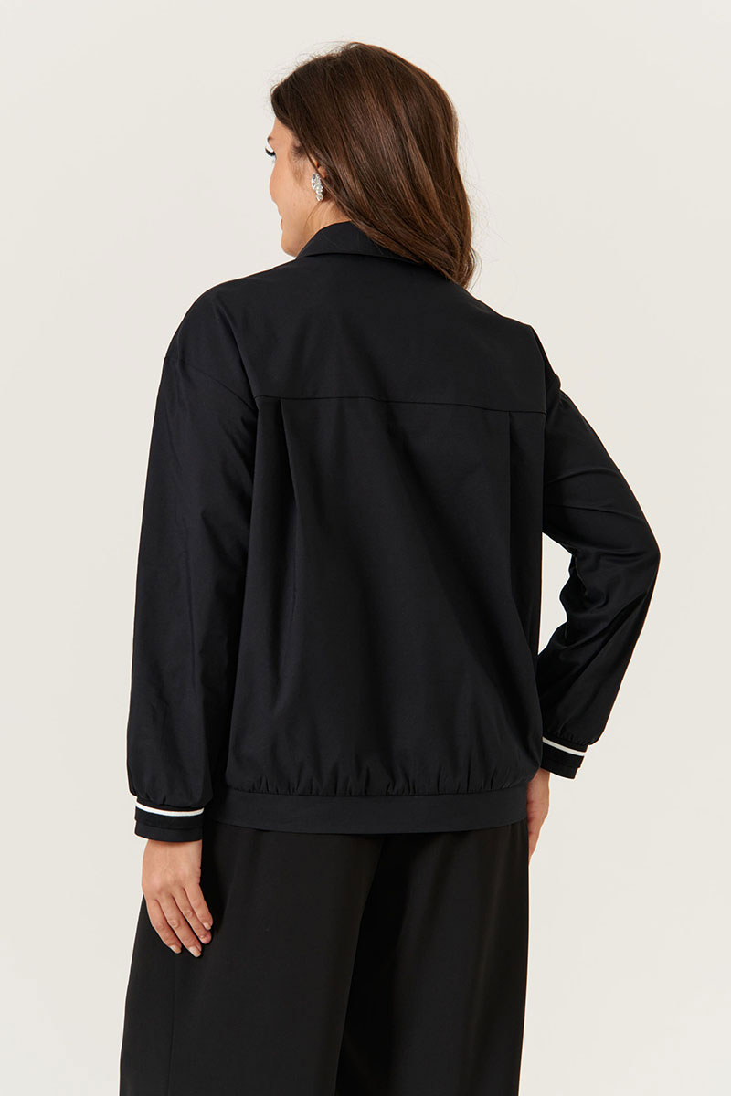 Женская черная блузка из смесовой ткани с высоким содержанием хлопка. Модель выполнена с центральной застежкой на обметанные петли и пуговицы, перед украшен двумя нагрудными вытачками и двумя прорезными карманами в рамку с обтачками, застегивающимися на пуговицу. Низ переда украшен декоративной резинкой, а спинка — отрезной кокеткой для лучшей посадки. Горловина оформлена рубашечным воротником с отрезной стойкой. Длинные втачные рукава завершены притачными манжетами с декоративной резинкой. Стильная и практичная блузка подойдет для повседневного и делового образа.