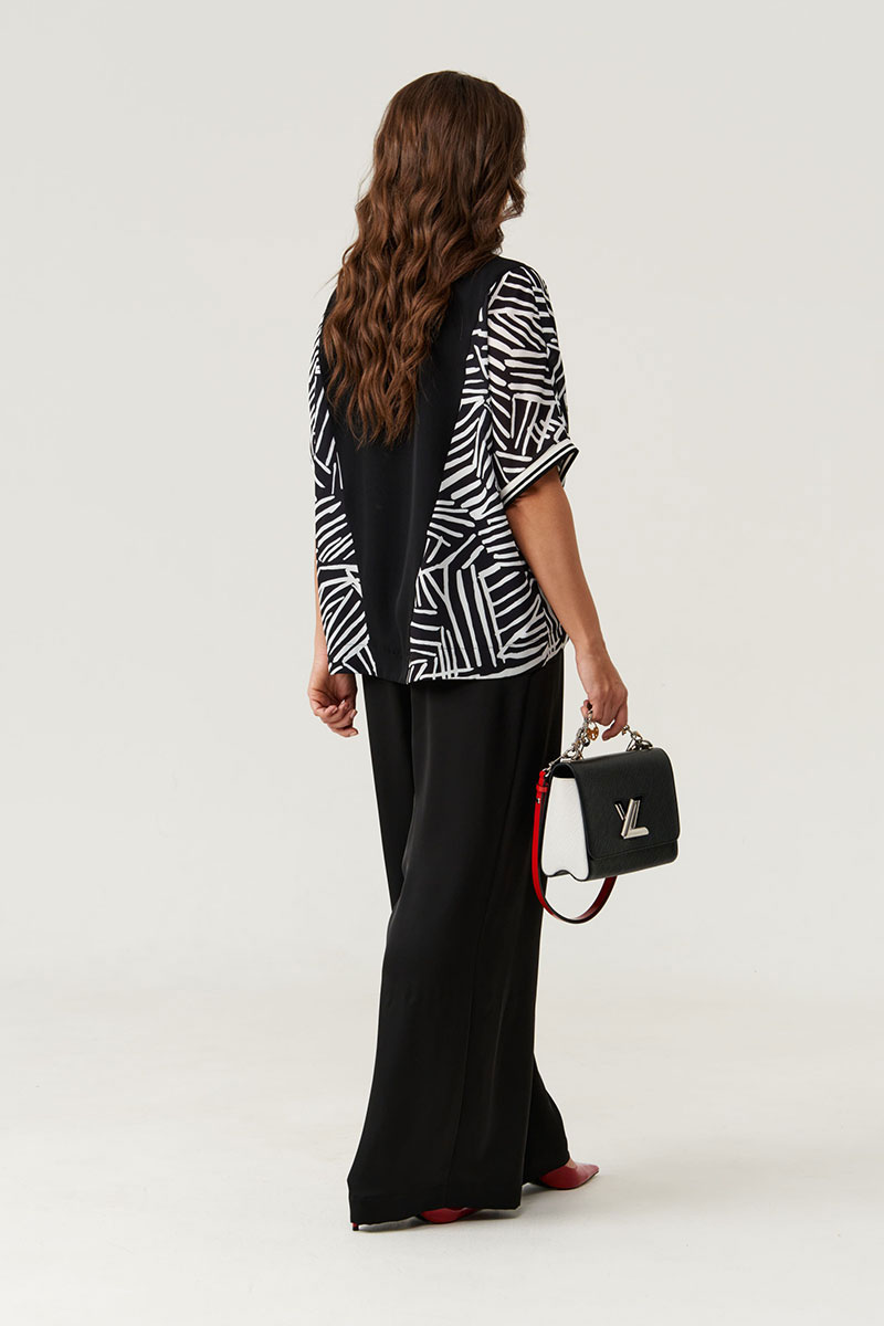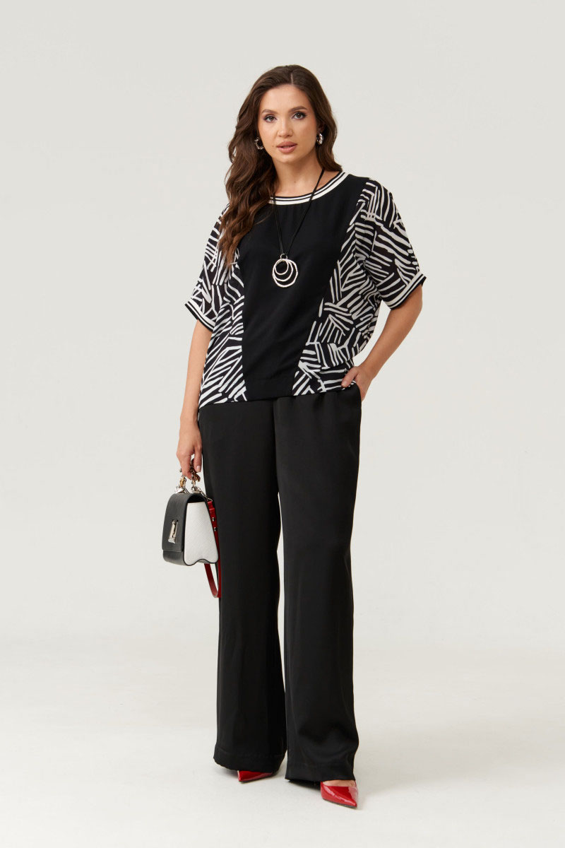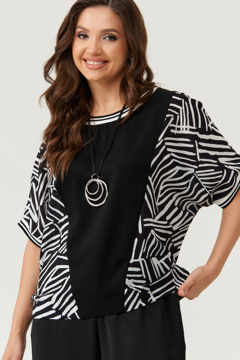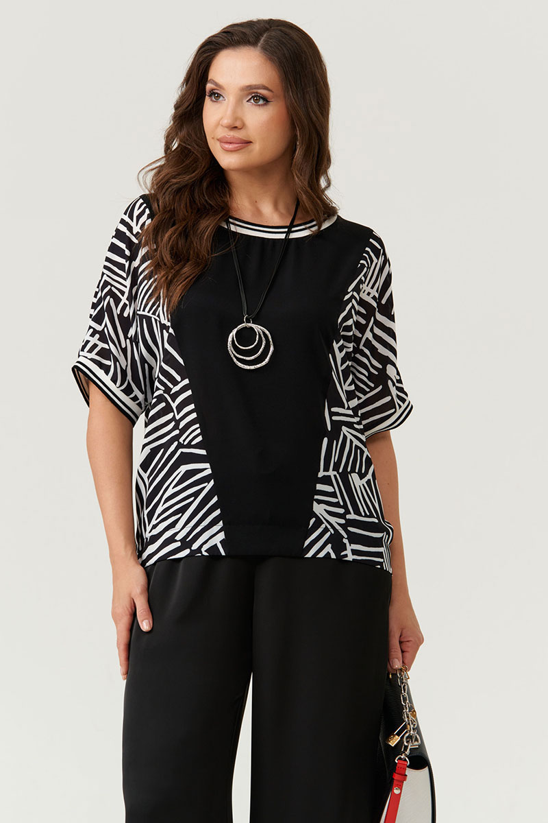 Блуза из лёгкой струящейся ткани для повседневной носки. Изделие свободного силуэта с коротким цельнокроеным рукавом, оформленным довязом. Линия плеча слегка спущена. Горловина круглая оформлена довязом. По переду и спинке рельефные швы. Низ блузки фигурный с перепадом длины, спинка длиннее переда. Длина изделия классическая.
