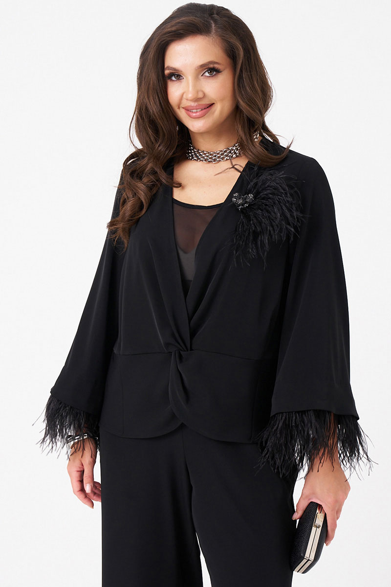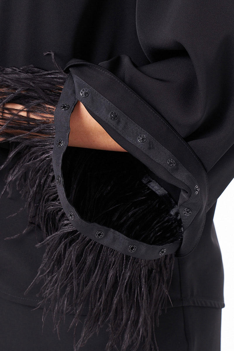 Передняя часть украшена подрезом и перекрутом, создающими красивые складки и придающими изделию изящный вид. Рукава втачные длинные, расширяющиеся к низу, украшены декоративной тесьмой с перьями по краю. Перья крепятся на маленькие кнопки и при желании отстёгиваются дл ясоздания нового образа или для стирки блузки.