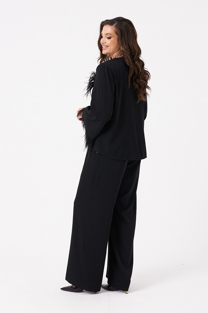 Спинка изделия выполнена со средним швом, что обеспечивает комфортную посадку. Цвет блузки — классический черный, что делает ее универсальной для различных случаев и легко сочетаемой с другими вещами.