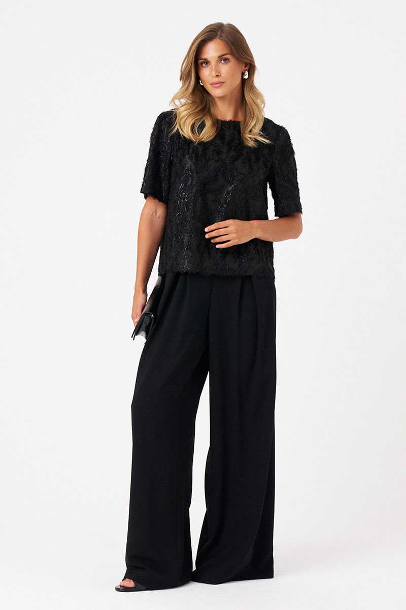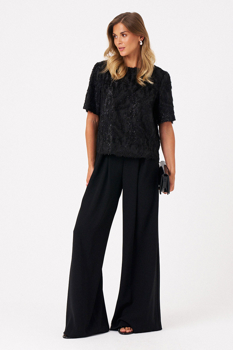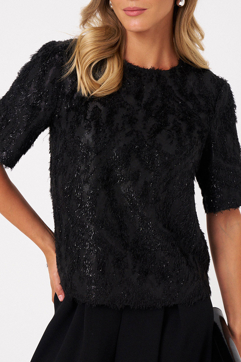 Это женская блузка из поливискозной ткани с лёгки блеском и ворсом. Модель выполнена в прямом силуэте и отличается оригинальным материалом, напоминающим травку, что придает ей свежий и необычный внешний вид. Перед с двумя нагрудными вытачками, которые подчеркивают линию груди и обеспечивают аккуратную посадку. Спинка с средним швом и застежкой-капелькой обеспечивает удобство надевания и комфорт в носке. Горловина чуть расширена, что добавляет образу легкости и элегантности. Короткие втачные рукава делают блузку практичной и универсальной для повседневных образов. Блузка выполнена на трикотажной подкладке, что обеспечивает дополнительный комфорт. Блузка для повседневной либо торжественной носки. Благодаря черному цвету она отлично подходит для создания стильных и комфортных повседневных луков.