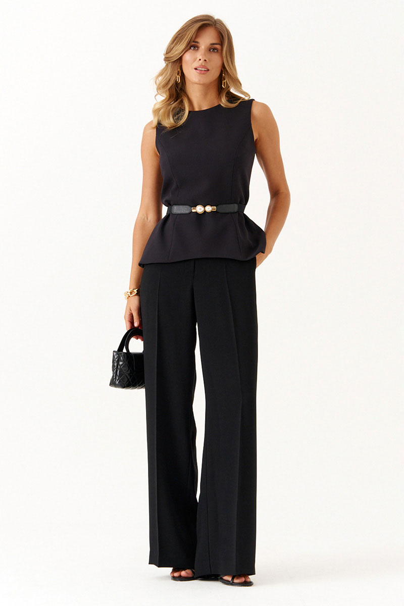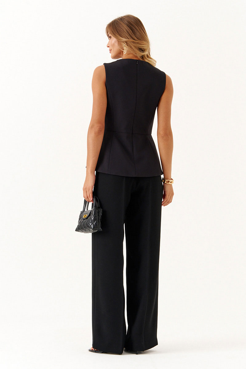Спинка блузки также оформлена несколькими рельефами: два из них начинаются от проймы в верхней части, а ещё два – в нижней, что помогает модели хорошо сидеть по фигуре и сохранять форму. По центру спинки расположен средний шов со скрытой потайной молнией, благодаря которой блузку удобно надевать и снимать, не нарушая плавность силуэта. Расширенная горловина придаёт образу элегантность и свободу, обеспечивая комфорт даже в тёплую погоду, а отсутствие рукавов делает модель лёгкой и универсальной для сочетания с различными элементами гардероба.