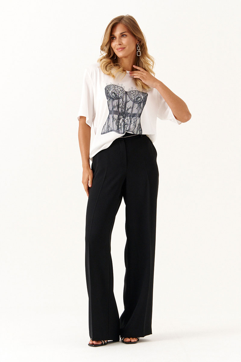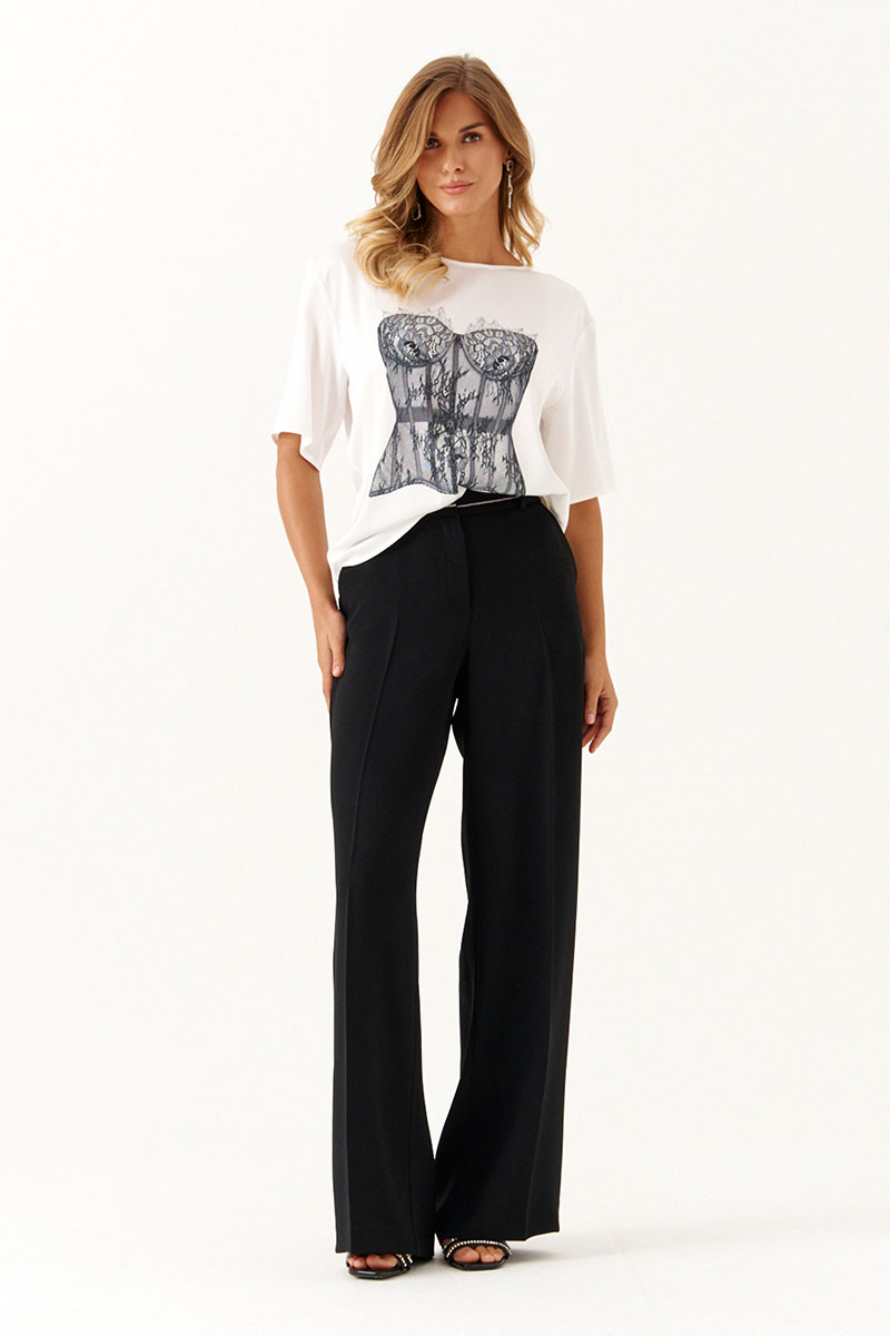 Женская блузка из струящейся ткани молочного цвета. Стильная и удобная блузка прямого силуэта создана из легкой струящейся ткани, идеально подходящей для ежедневного образа. Расширенная горловина добавляет модели женственности и комфорта, а рукава длиной до локтя делают блузку универсальной для разных сезонов. Особенностью изделия является дизайнерская печать на передней части в виде изящного корсета, которая придаёт образу утонченность и оригинальность. Отличный выбор для создания нежного и элегантного повседневного стиля.
