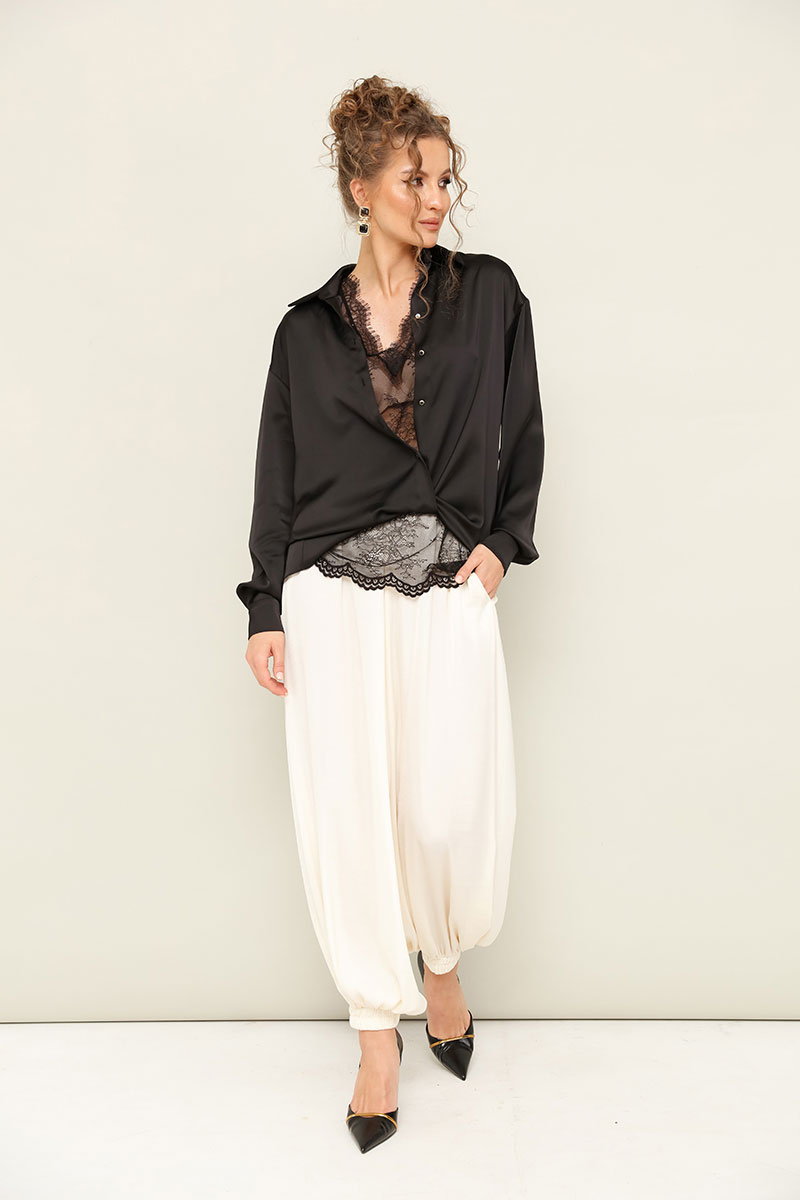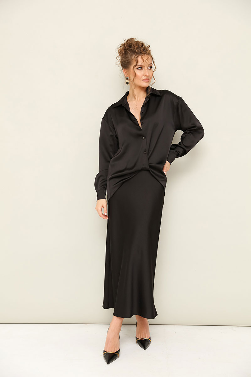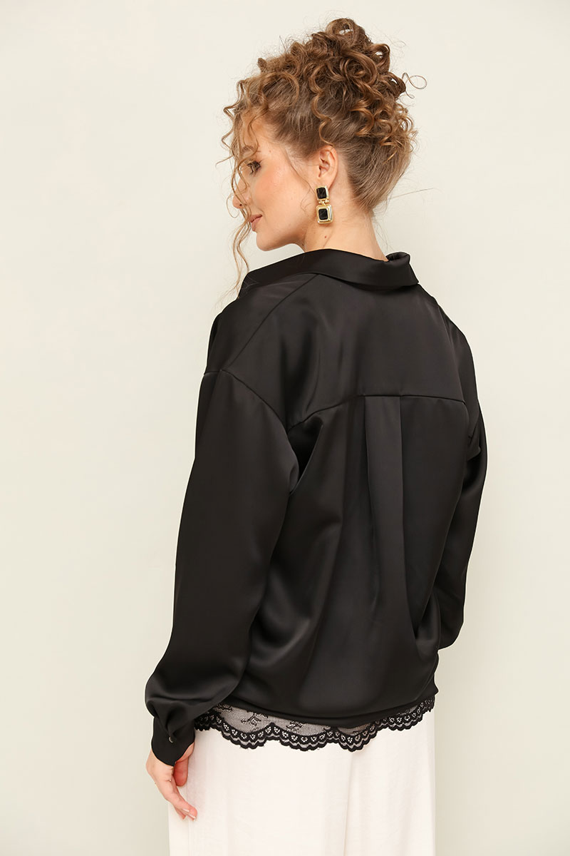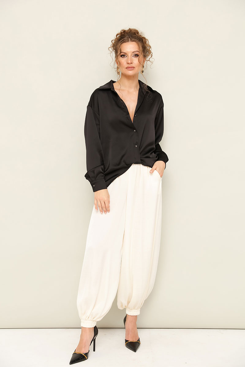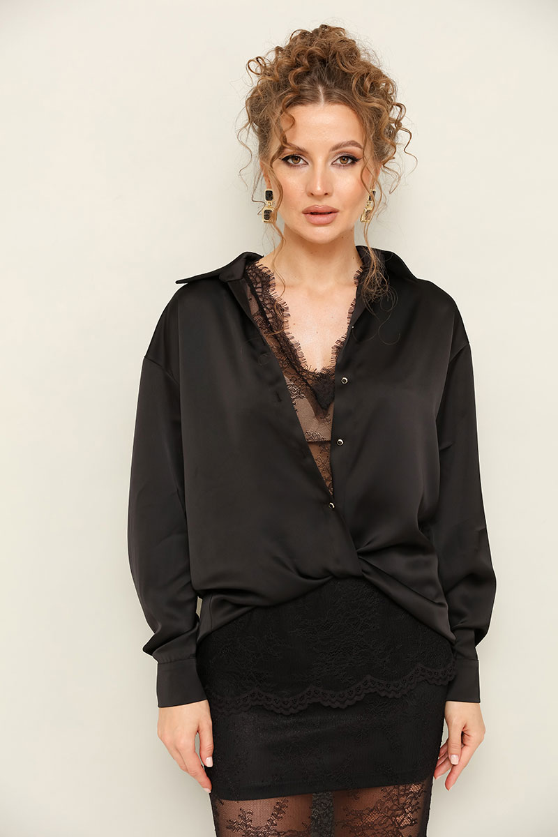 Элегантная блузка прямого кроя, выполнена из струящейся ткани с благородным матовым блеском. Горловина с рубашечным воротником на отрезной стойке, центральная застежка на петли и пуговицы. Перед блузки выполнен с декоративным перекрутом в низжней части застежки. Рукава со спущенной линией втачивания плеча, манжеты с застежкой на петли и пуговицы. Спинка с отрезной кокеткой и бантовой складкой.