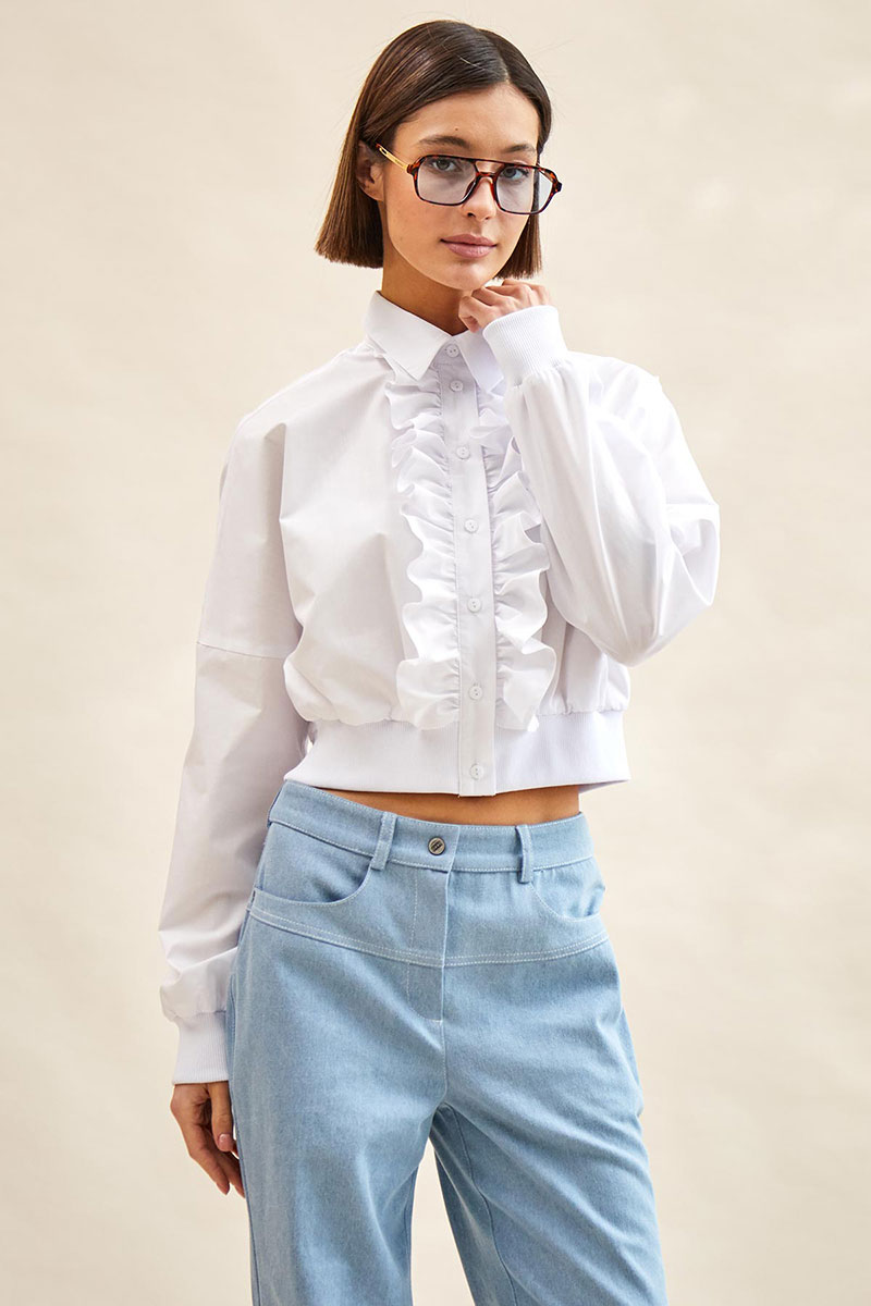 - застежка на планку с пуговицами и двумя оборками вдоль планки;