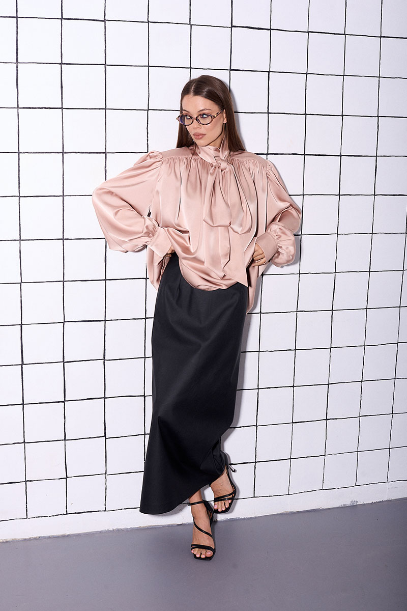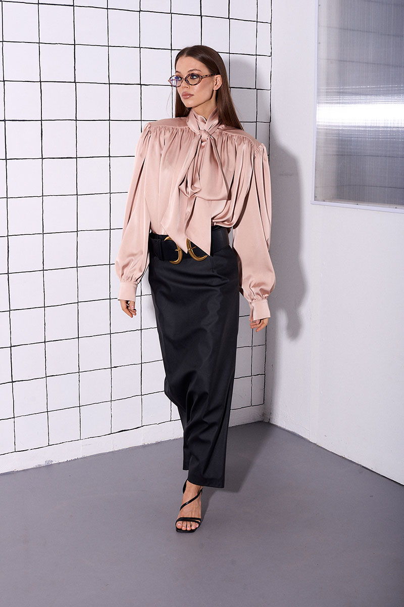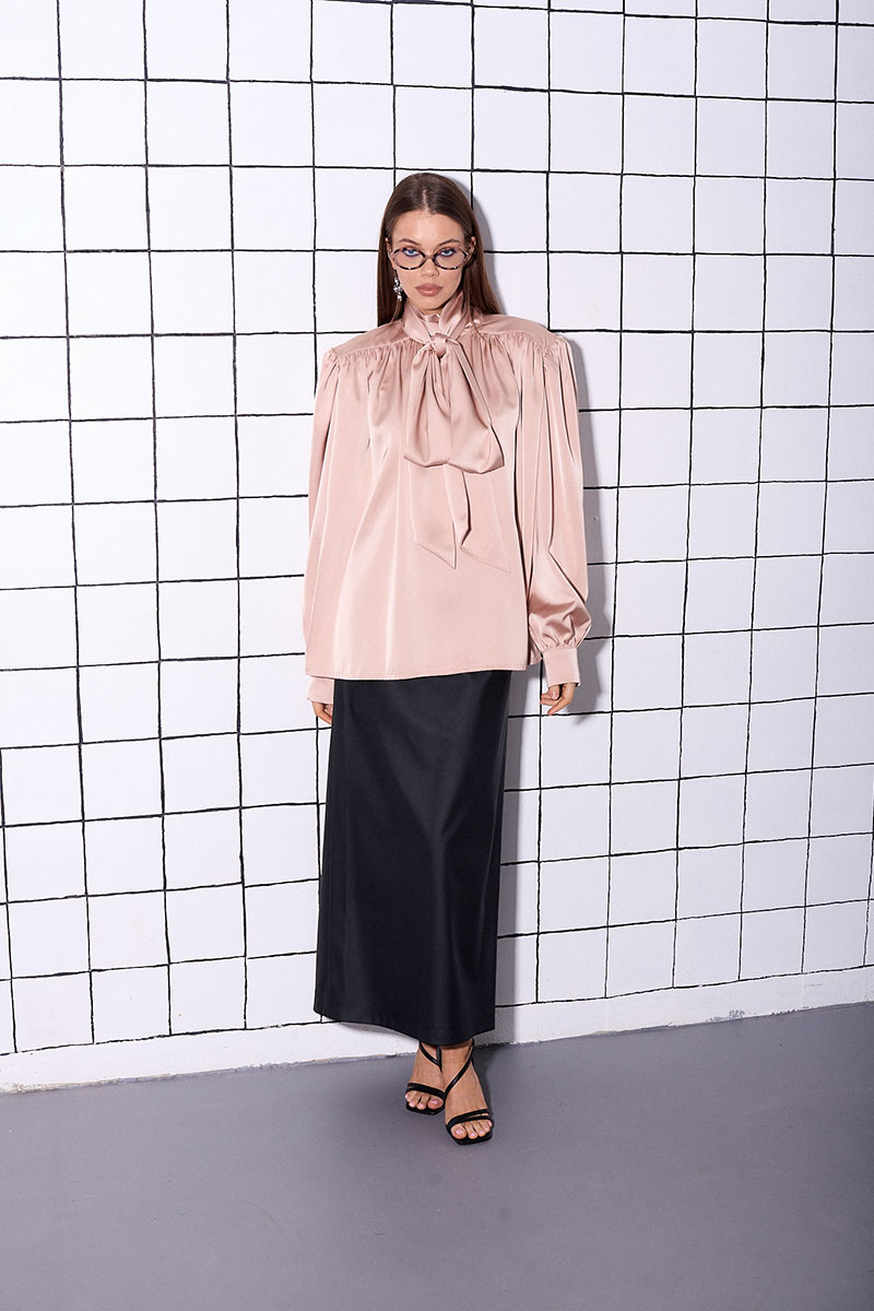 Блуза прямого,свободного силуэта, с акцентной линией плеча и сборкой (плечевые накладки съемные). Рукав спущенный, прямой, длинный с манжетой на пуговице. Горловина с акцентным декоративным бантом, которой можно носить не завязывая.
