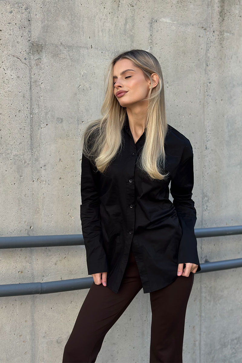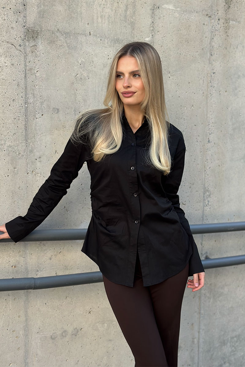 Блузка приталенного кроя, с акцентной сборкой по бокам и на рукавах изделия.