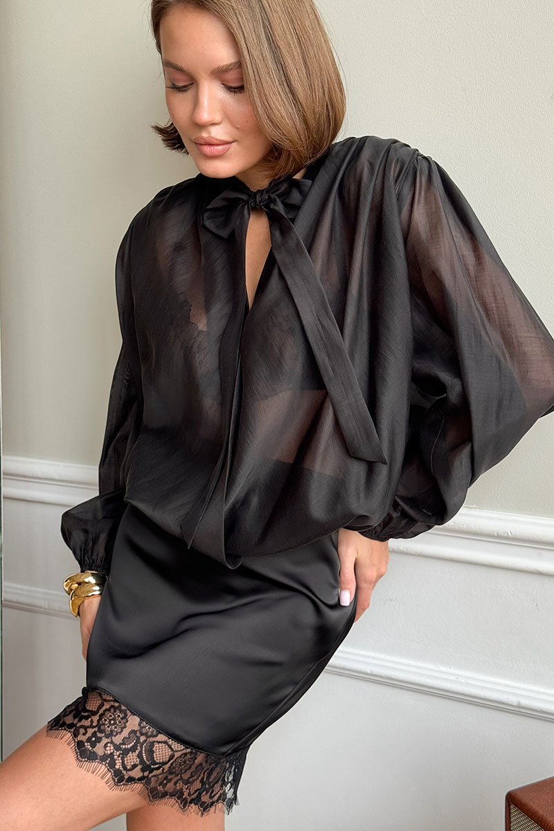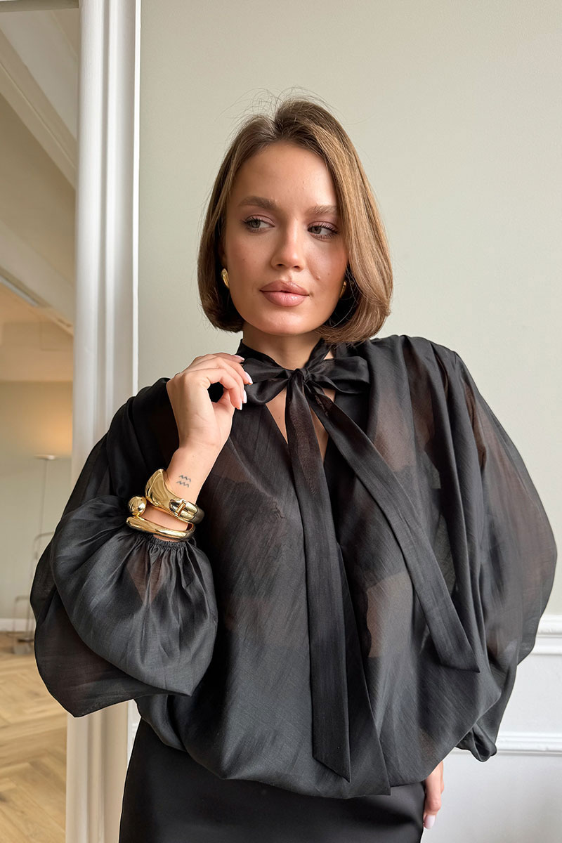 Блузка из невесомой струящейся ткани, с объемными плечами, по низу и на рукавах резинка.