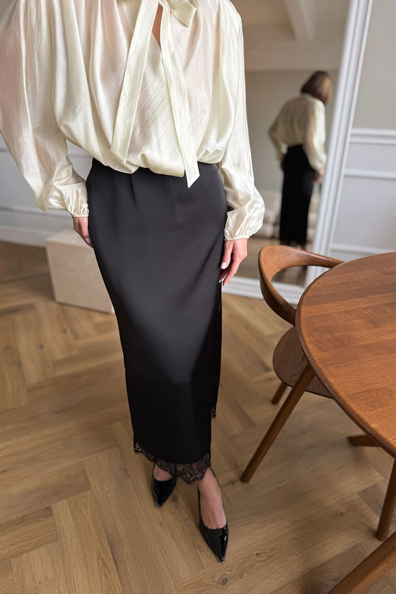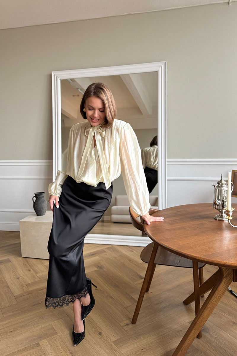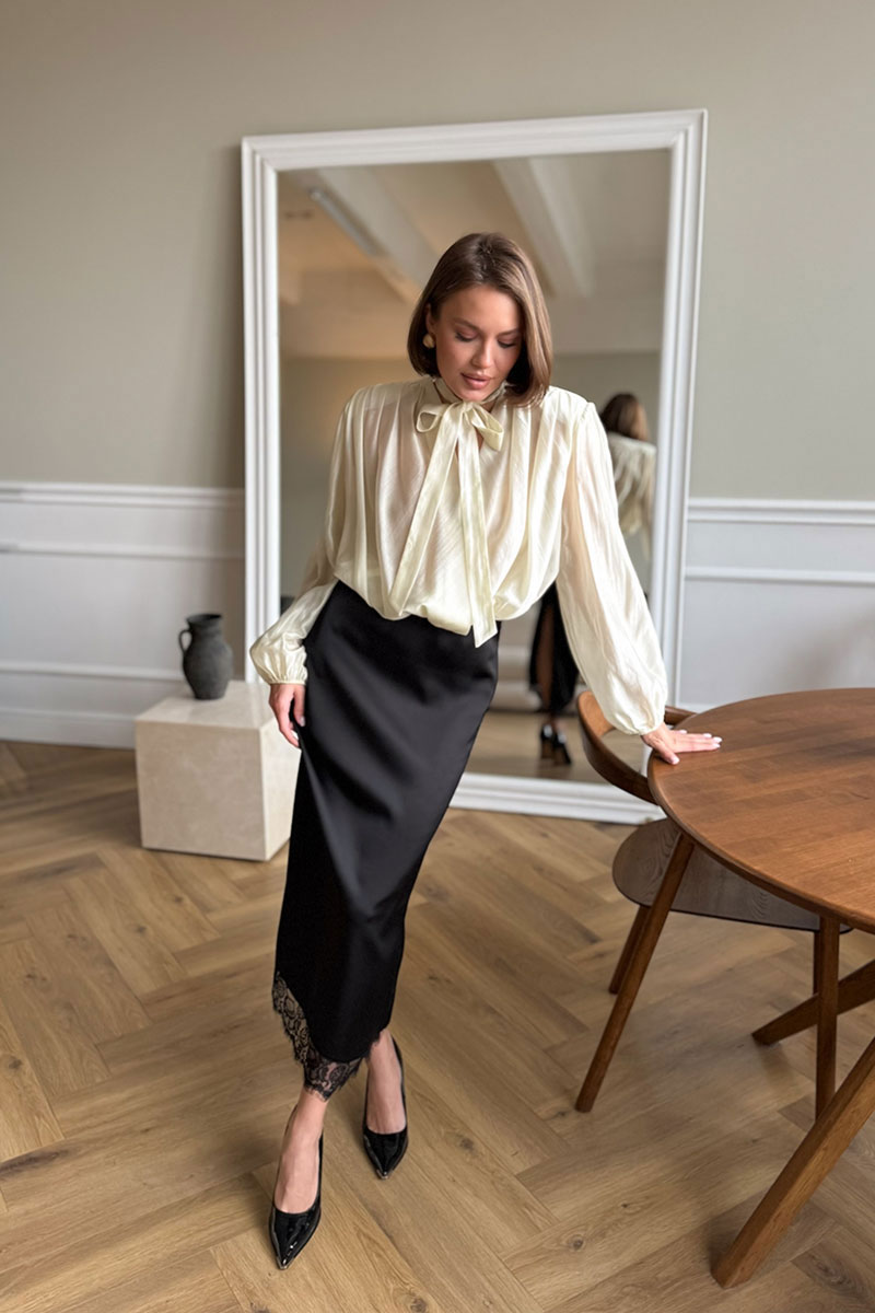 Блузка из невесомой струящейся ткани, с объемными плечами, по низу и на рукавах резинка.