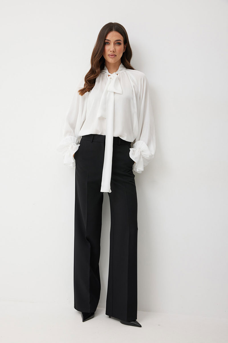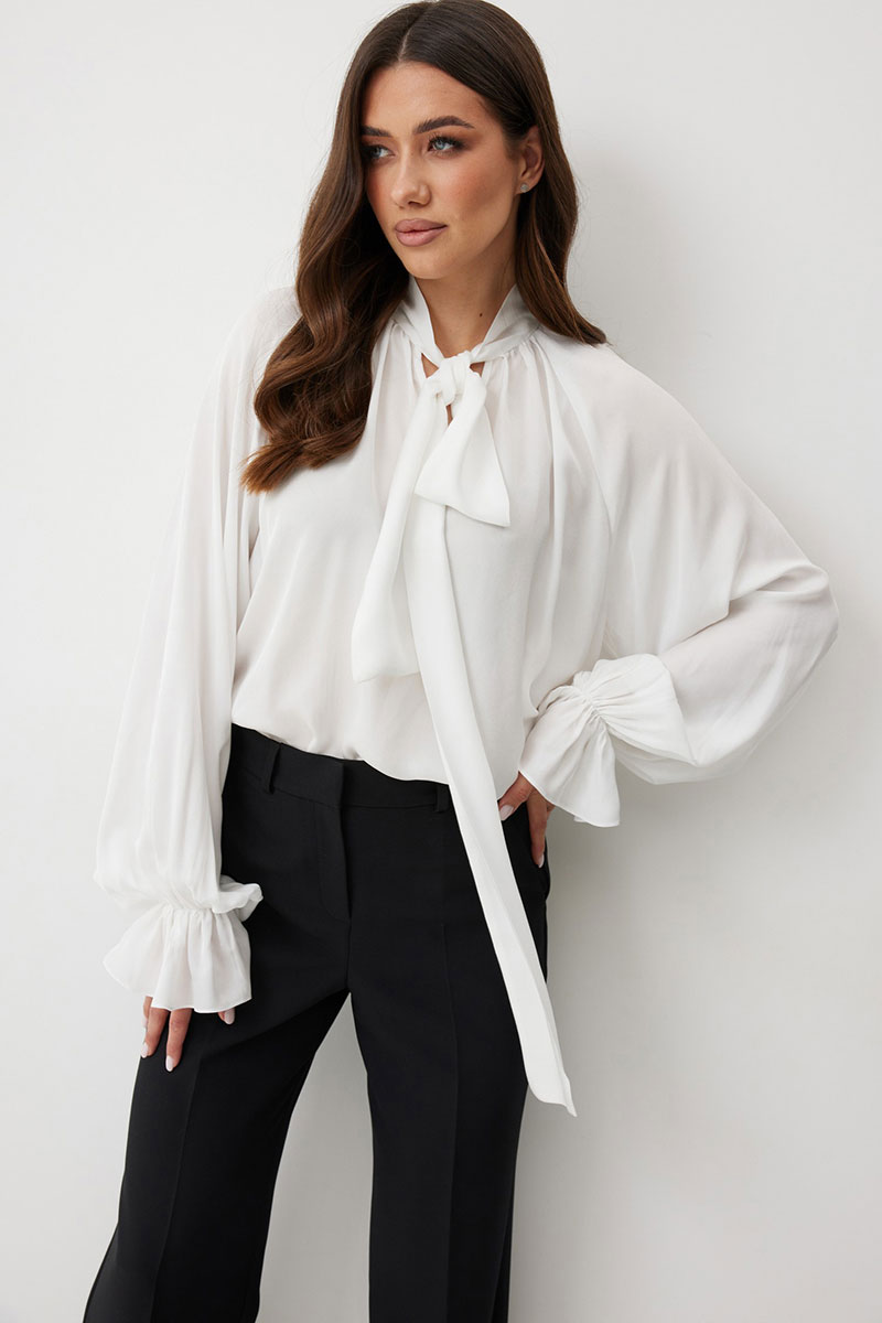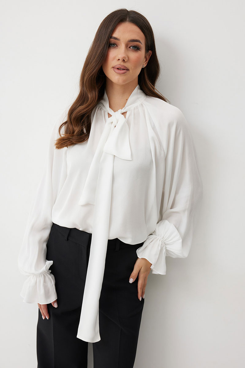 Женская блузка свободного силуэта из струящейся ткани — идеальное решение для создания романтичного и непринужденного образа. Вырез горловины округлый с с небельшим разрезом по переду. Воротник-стойка переходит в длинные завязки-ленты, которые вы можете завязать бантом или оформить любым другим способом. Рукав реглан, снизу рукава сборка на резинке и широкий волан. Эта блузка станет идеальной основой как для офисного, так и для вечернего или повседневного образа, добавляя ему нотку утонченной небрежности.