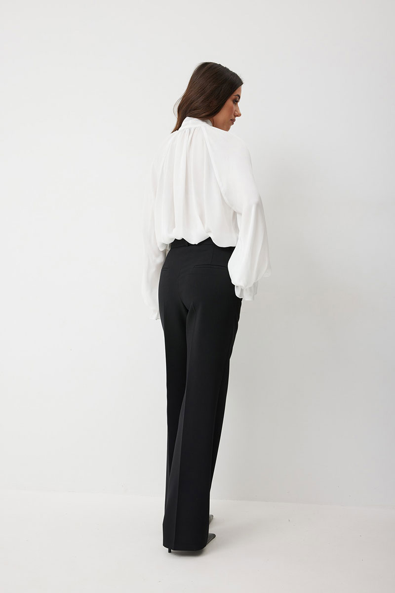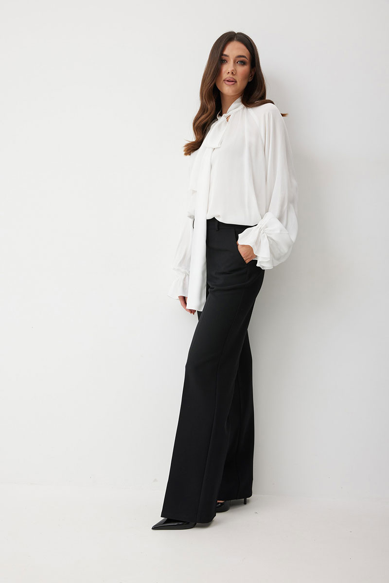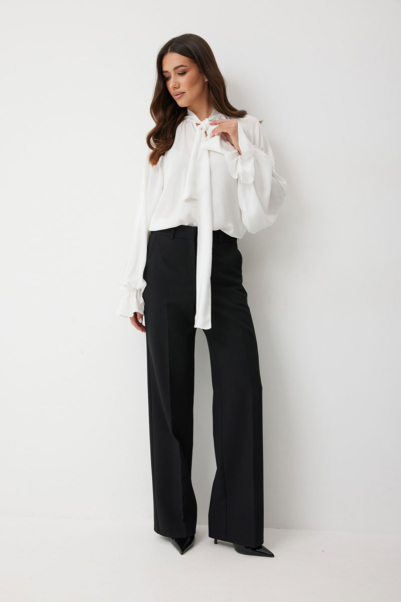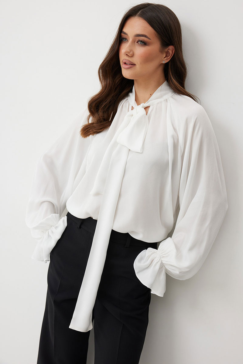 Женская блузка свободного силуэта из струящейся ткани — идеальное решение для создания романтичного и непринужденного образа. Вырез горловины округлый с с небельшим разрезом по переду. Воротник-стойка переходит в длинные завязки-ленты, которые вы можете завязать бантом или оформить любым другим способом. Рукав реглан, снизу рукава сборка на резинке и широкий волан. Эта блузка станет идеальной основой как для офисного, так и для вечернего или повседневного образа, добавляя ему нотку утонченной небрежности.