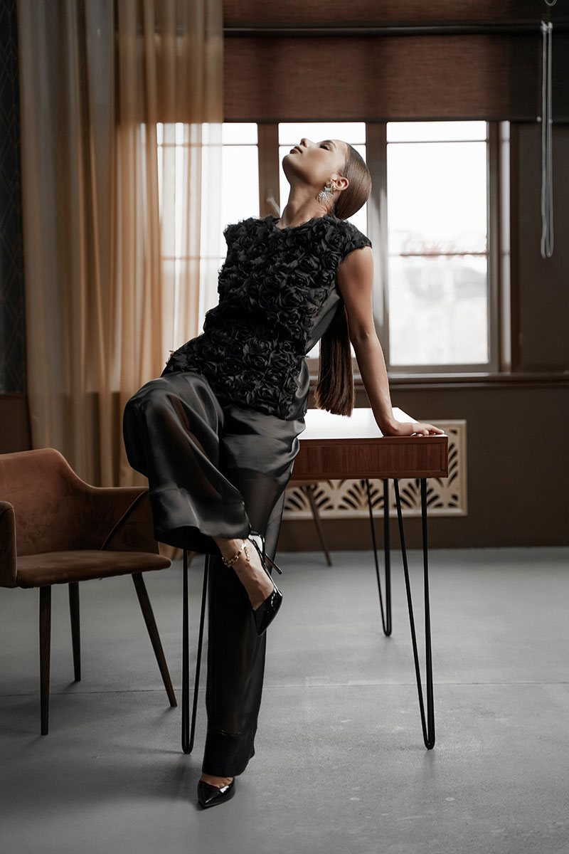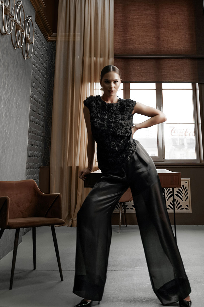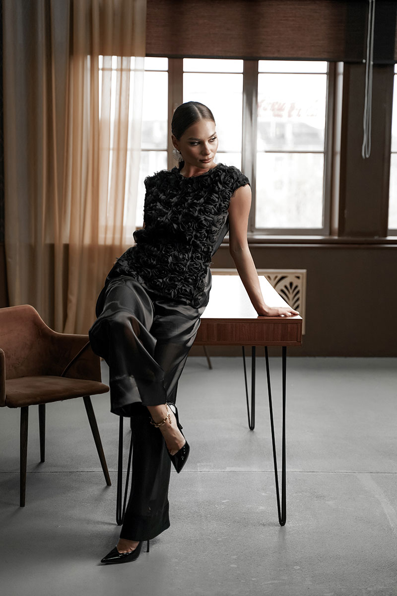 Блузка прямого силуэта со спущенным плечом. Перед из фактурной ткани «розы