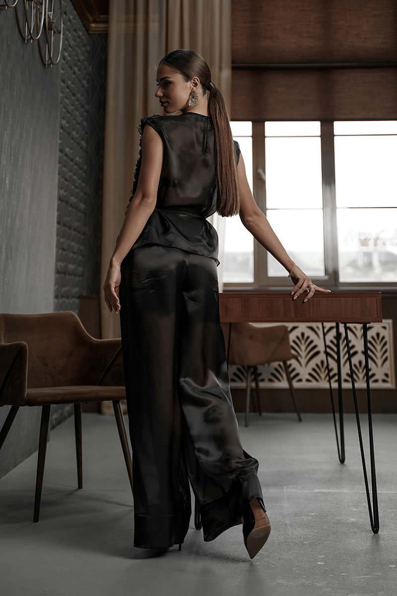 на сетке», спинка из полупрозрачной ткани «органза».  Горловина округлой формы, по спинке застежка на навесную петлю и пуговицу. Перед на атласной подкладке.