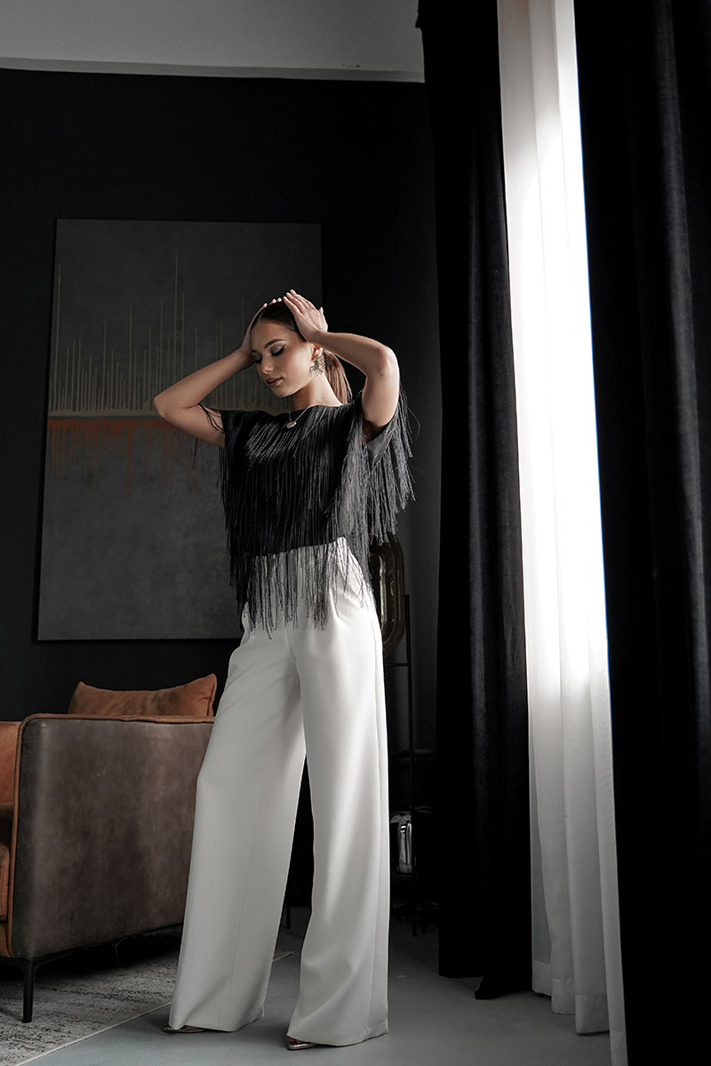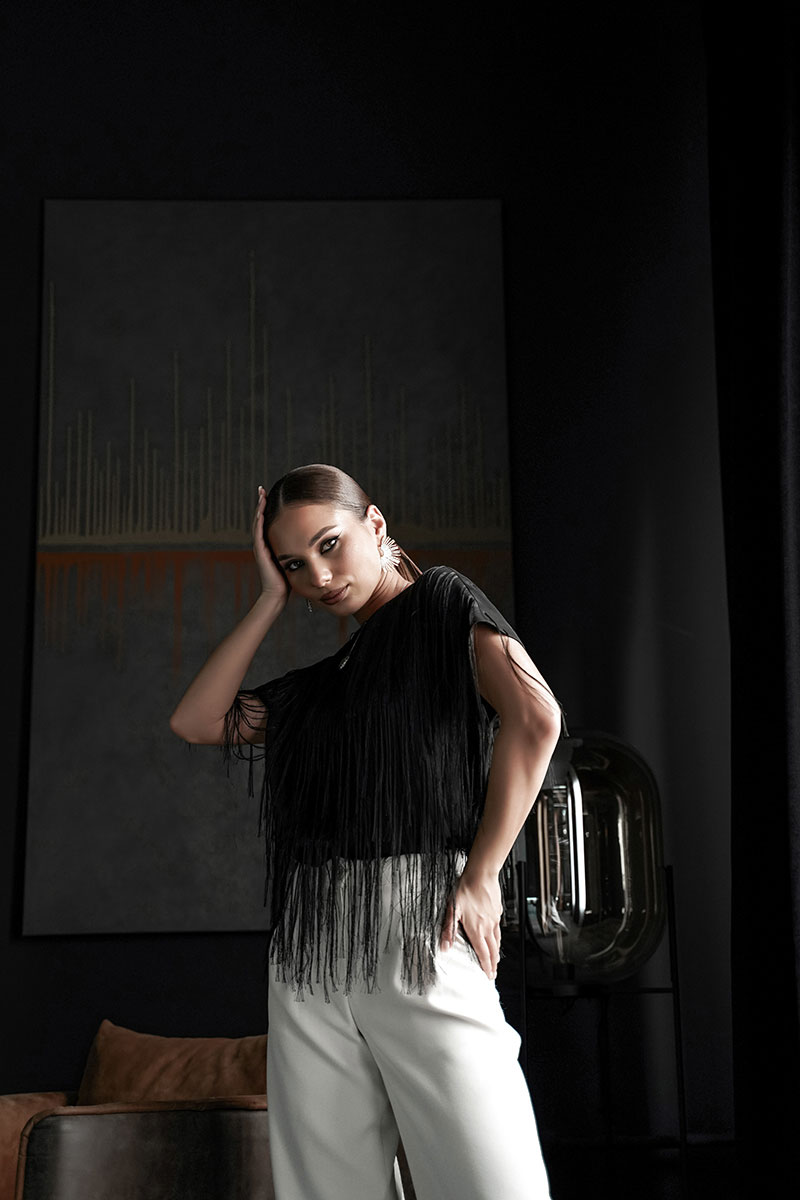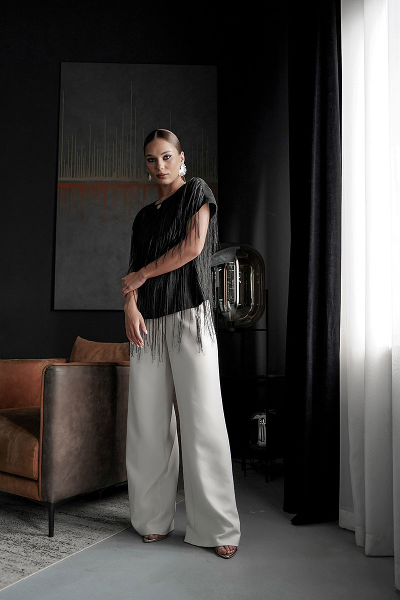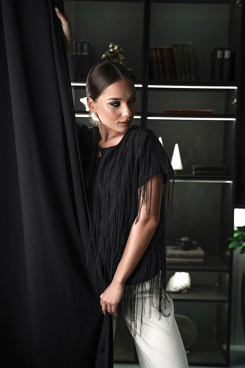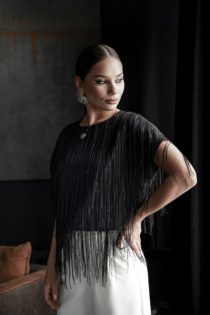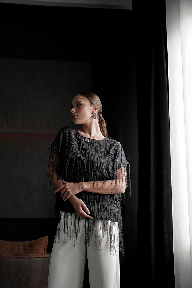 Блузка свободного силуэта с коротким цельновыкроенным рукавом, из нарядной плательно-блузочной ткани с бахромой. По переду горловина округлой формы, по спинке-V-образной. Блузка на атласной подкладке.