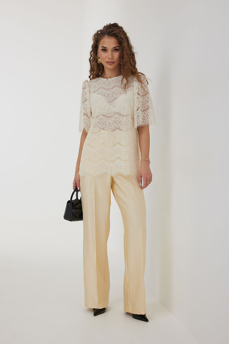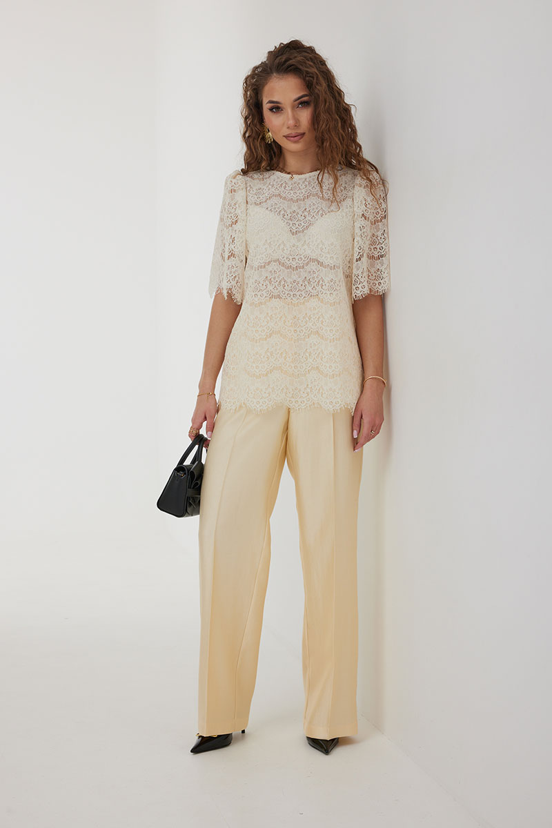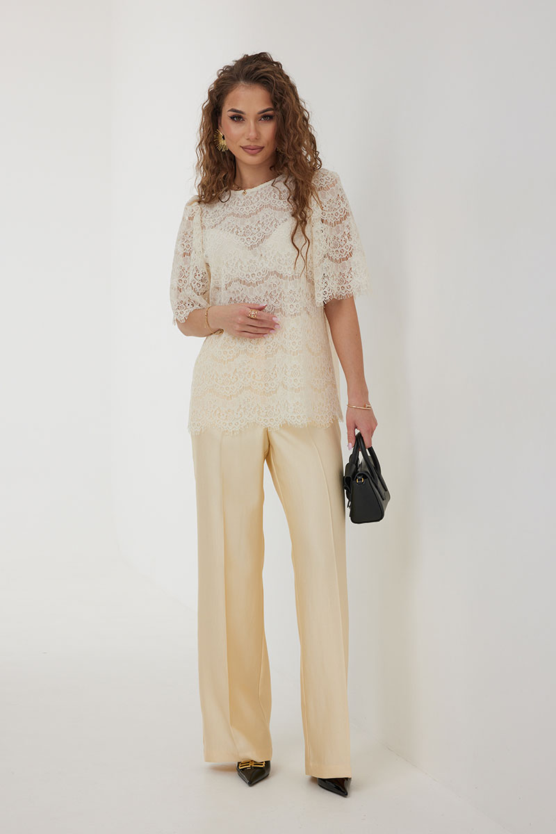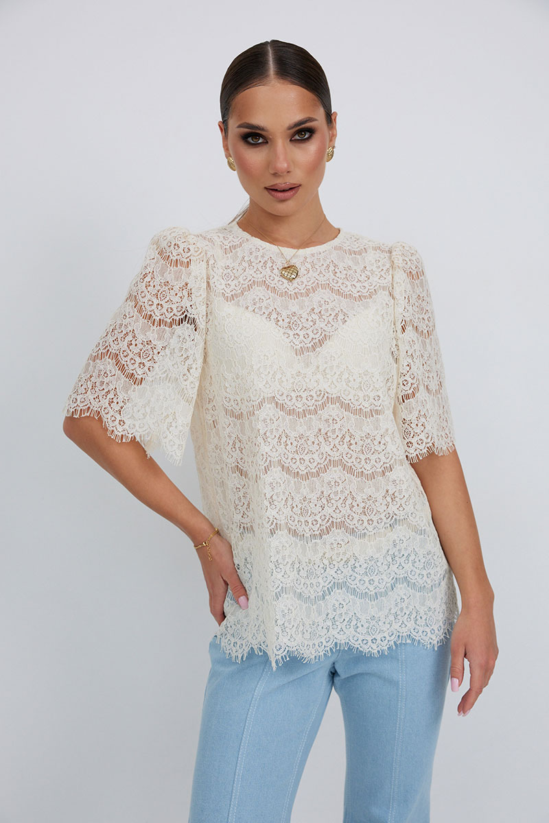 Блузка прямого силуэта с укороченным плечом из кружевной ткани. Горловина округлой формы, по спинке застежка на навесную петлю и пуговицу. Рукав свободный длиной до локтя, со сборкой в верхней части. Спинка и перед на подкладке сетка.