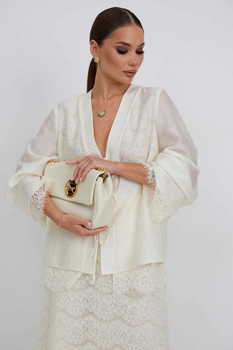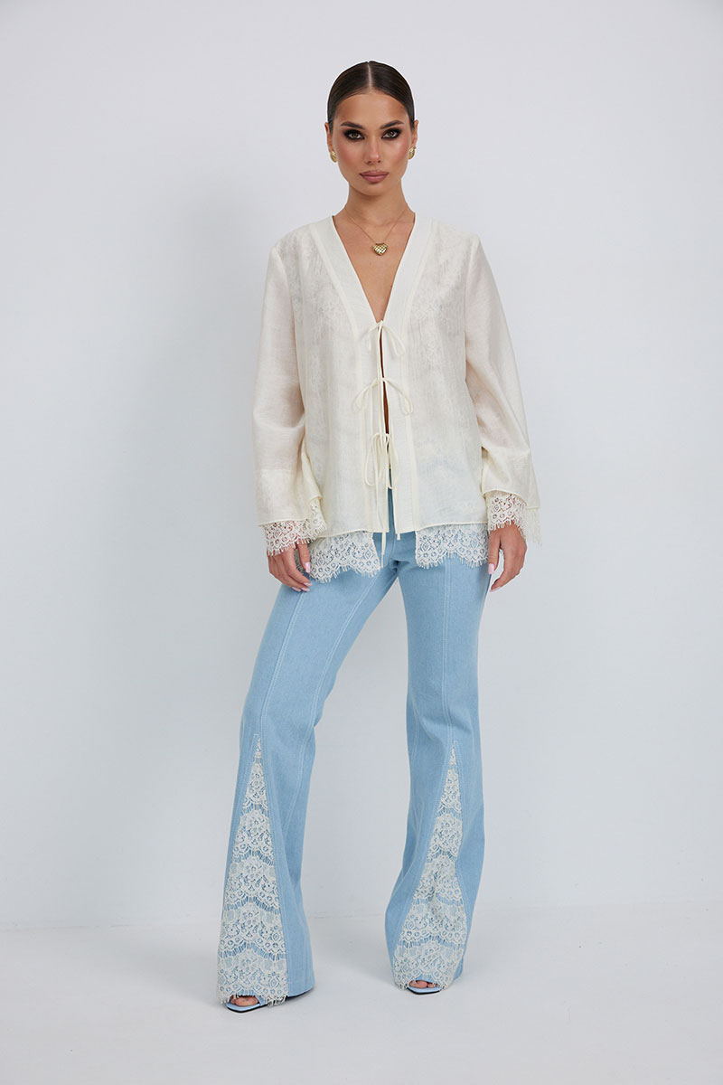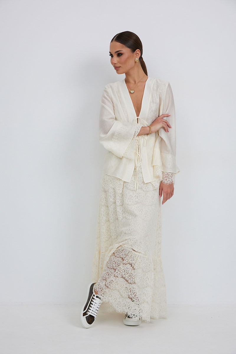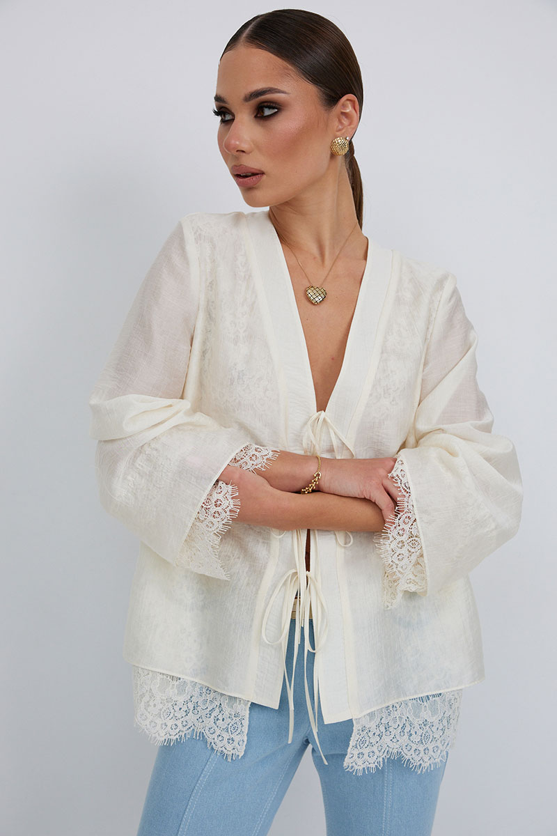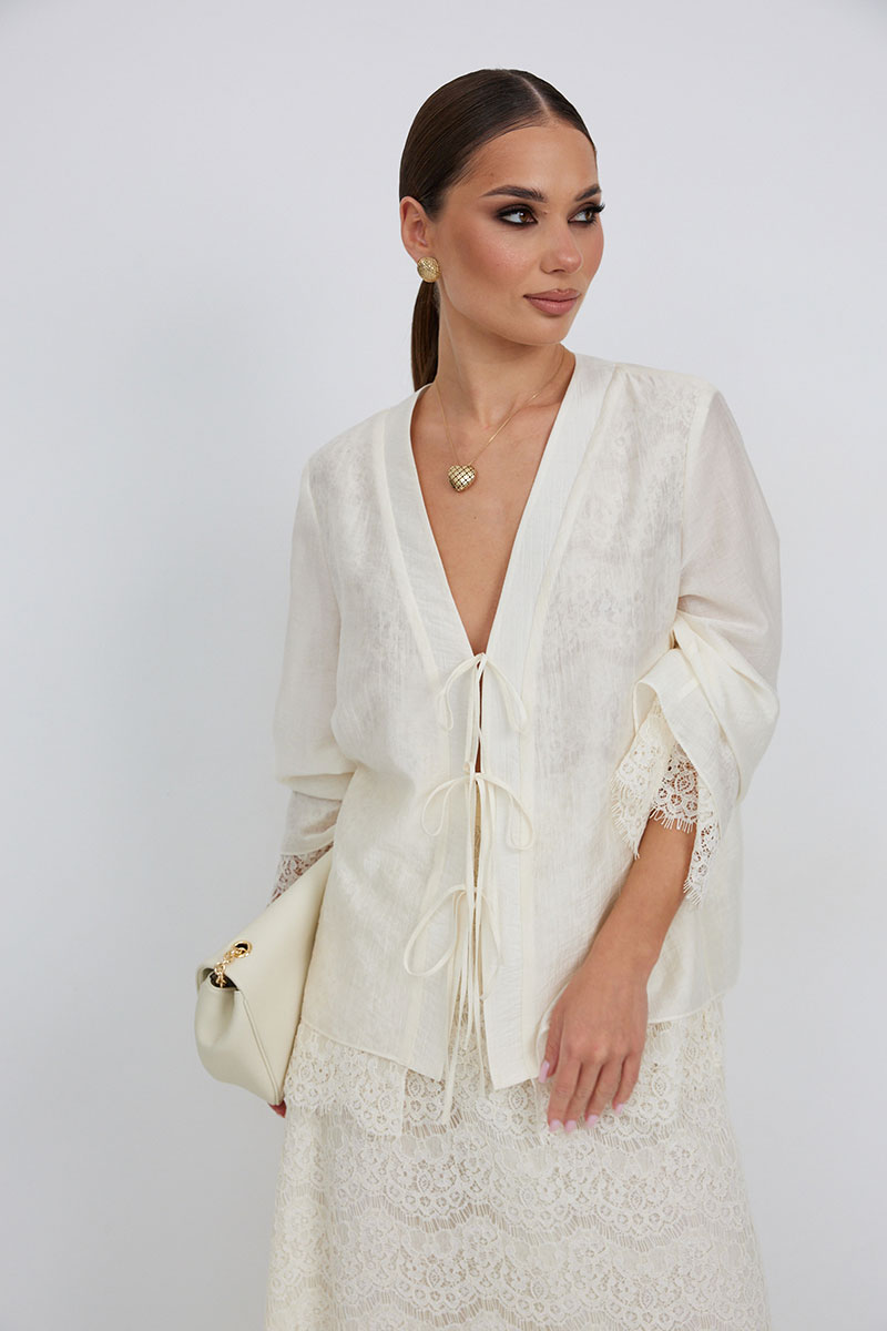 Блузка женская свободного силуэта, из полупрозрачной вуали. Спинка и перед на кружевной подкладке. Застежка на планку с тремя завязками. Рукав втачной длинный расширенный книзу, по низу рукава кружевная широкая манжета, имитирующая многослойность.