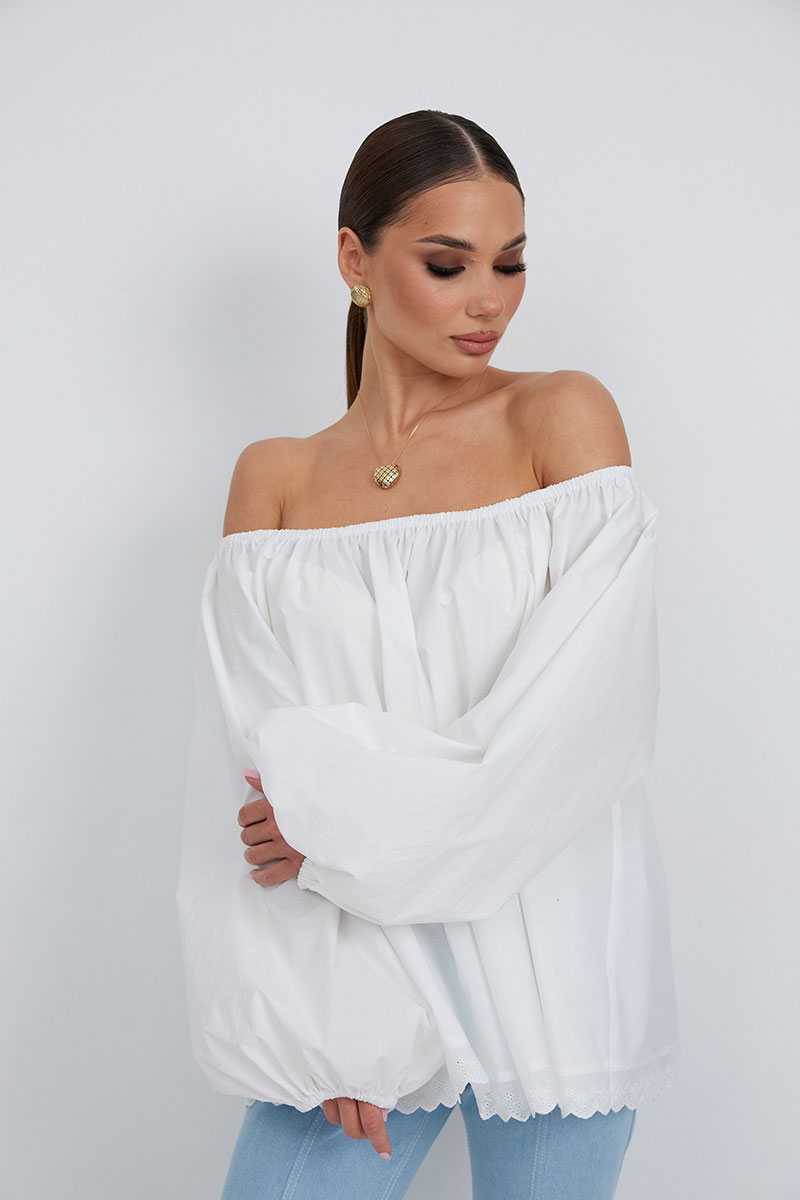 Блузка женская объёмного силуэта, длиной до уровня бедер. Вырез горловины плавной округлой формы, по верху переда, спинки и рукавов резинка. Рукав длинный объёмный. По низу рукава кулиса с резинкой, позволяющая приспустить или поднять рукав выше. Низ блузки обработан хлопковым кружевом.